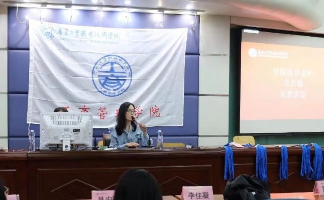 首先,由李佳凝为大会致辞。她总结了事管会快速成长的经历,肯定了这一学生组织对于学院师生的意义以及做出的贡献,表扬了全体同学无私付出的精神和踏实勤勉的工作作风,也鼓励同学们“筑梦踏实”,心怀远大的目标,同时走好脚下的每一步路。
