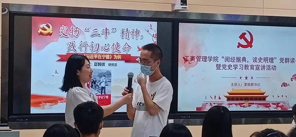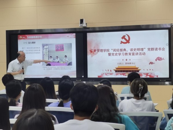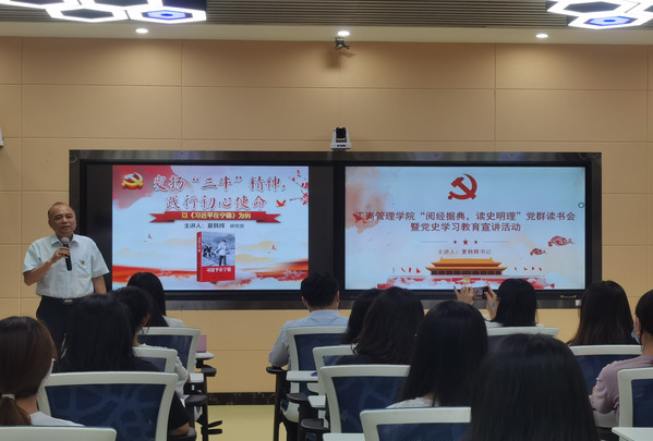 为深入学习党的光辉历史,加强党史学习教育,根据党史学习教育计划安排,工商管理学院于6月7日晚上在白云校区开展“阅经据典,读史明理”党群读书会暨党史学习教育宣讲活动,邀请校党史学习教育宣讲团团长、学校党委副书记、纪委书记夏韩辉同志主讲,宣讲会由学院党总支书记周清莲主持,机电工程学院党总支书记梁超鹏、辅导员阳洋和学院50余名学生党员参加。