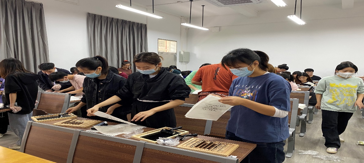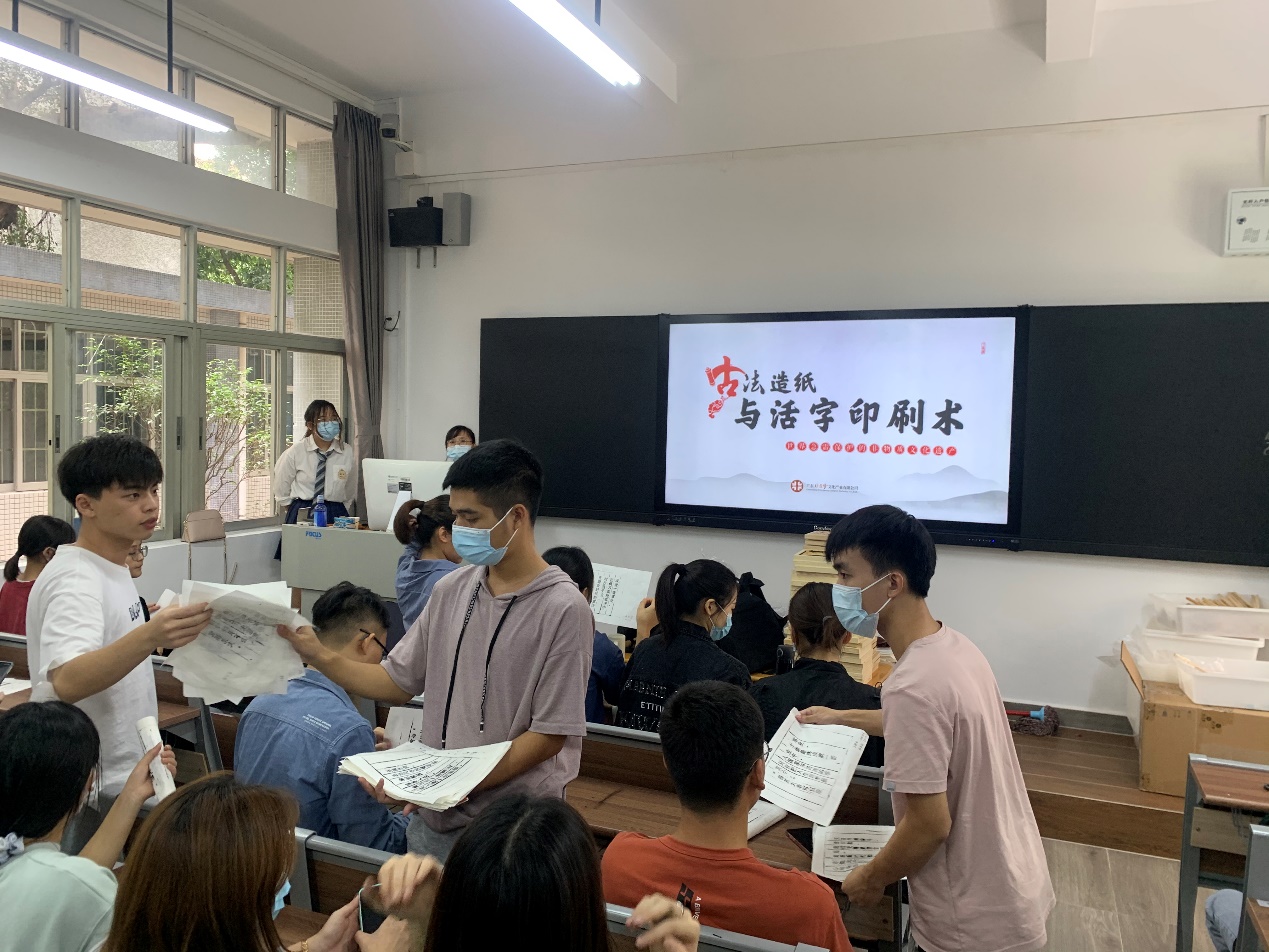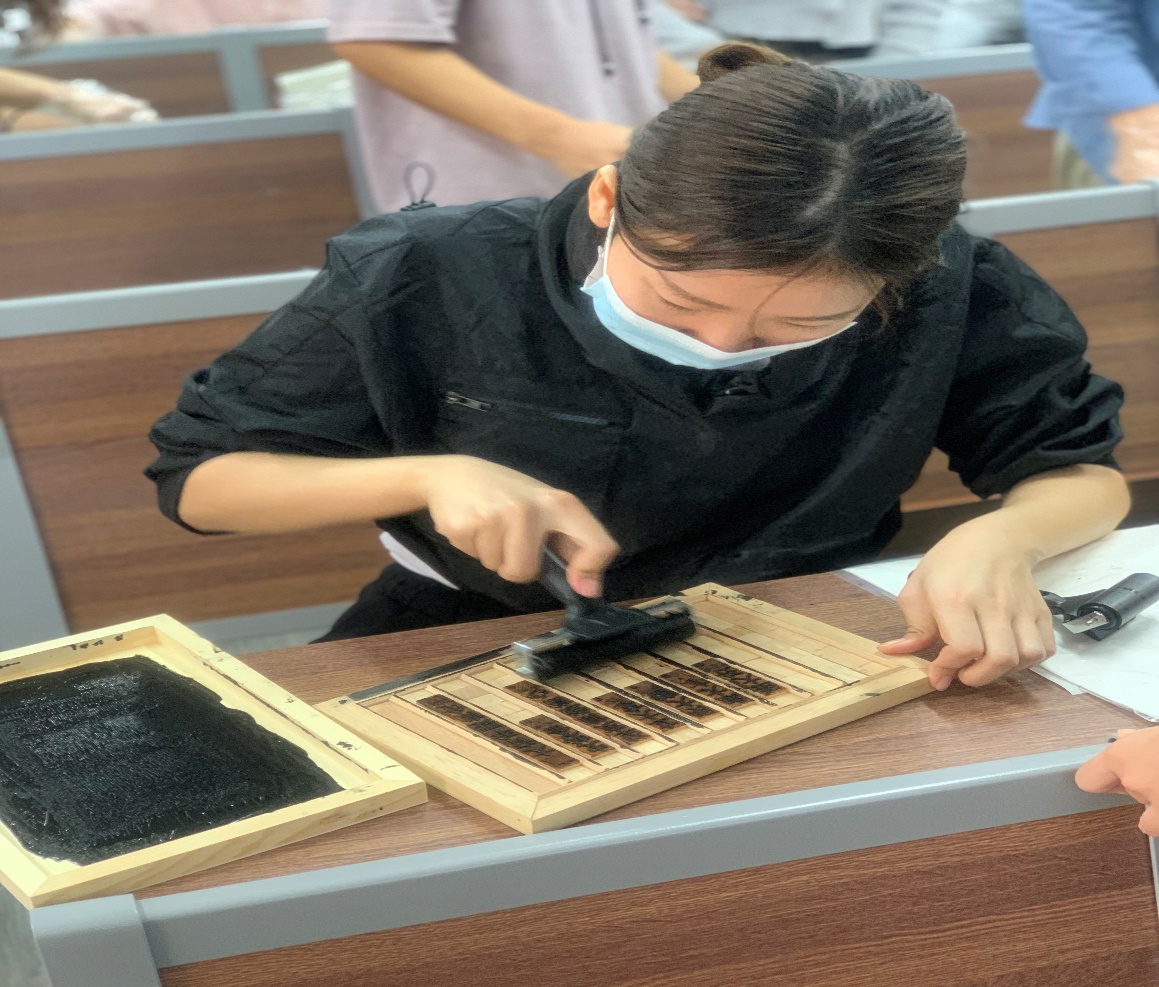 活动开始,同学们在广东非遗梦文化产业有限公司工作人员的指导下,通过线上的方式观看学习了中国古法造纸、活字印刷术的发展和技术,了解到中国文化的重要性和传承非物质文化遗产的重要意义。在接下来的实践环节中,同学们动手体验古代四大发明中的造纸术和印刷术的制作过程,把习近平总书记在“七一”重要讲话中的“金句”通过传统印刷术印制在纸上。