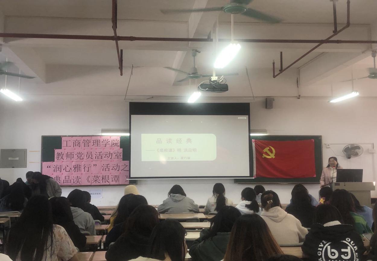 为进一步丰富校园文化生活,营造浓厚的书香氛围,借以传承国学文化经典,弘扬民族文化精髓,激发广大青年读书的热情,11月11日,工商管理学院教师党员工作室在白云校区明德楼2区604开展了“润心雅行”服务之经典品读活动。活动由“经典品读”教师党员工作室负责人梁巧丽主持,近100名学生参加。
