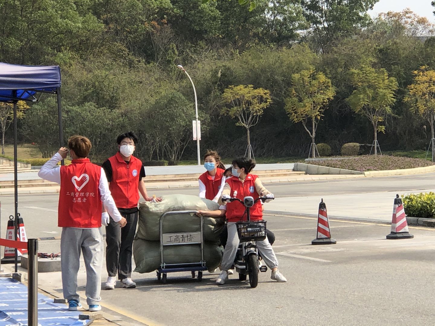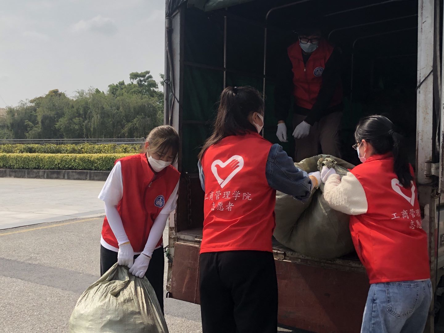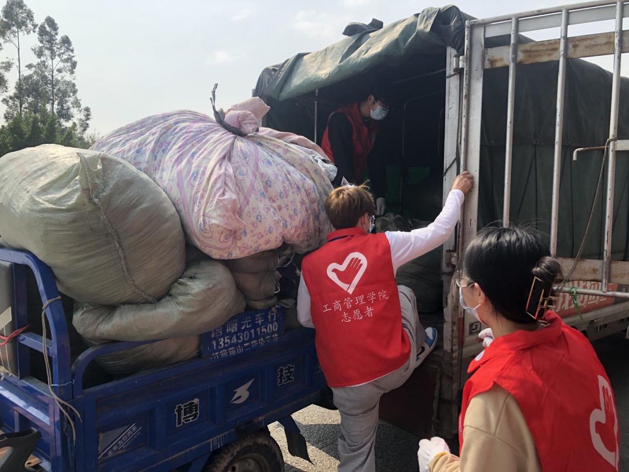此次的衣物数量较大,志愿者们分工合作,将师生捐献的衣物一件件整理,叠放整齐后装进环保袋里。由于疫情防控的原因,外来的司机无法进入学校,为此志愿者们借来了三轮车,把衣物运送到学校门口,并在校门口与司机进行工作交接。