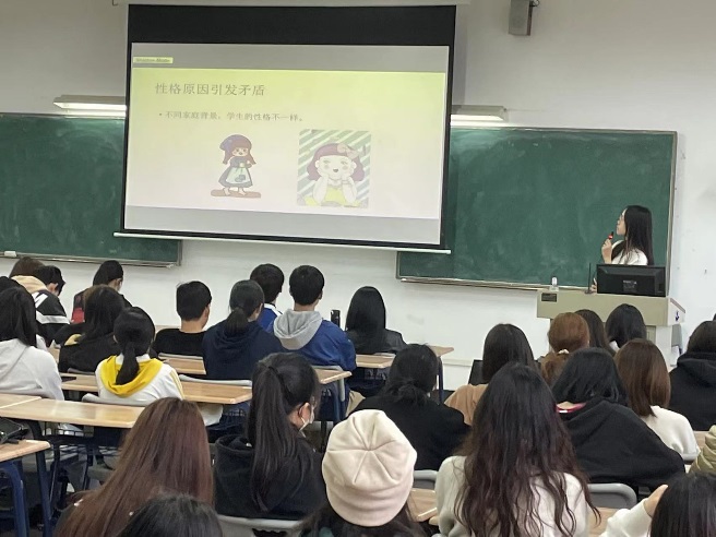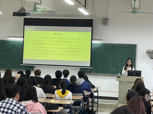 欧阳翠婷以学生生活情境为切入点,先介绍引起宿舍矛盾的导火线,再阐述矛盾爆发的后果,包括言语攻击、打架斗殴等,然后以马加爵事件为案例,提示宿舍矛盾一旦进一步激化,将可能导致流血事件,为宿舍长敲起警钟。事物的变化发展总是从量变开始,最终引起质变。她采用层层递进的方式,介绍了宿舍常见心理问题及产生原因,引导宿舍长正确、理性看待宿舍问题,从深层次认识到若不及时化解宿舍小矛盾,最后可能会酿成惨剧,并针对宿舍问题,提出内部自我调适措施和外部化解对策的应对措施。最后,她对心理疾病进行重点介绍,提醒宿舍长需关注识别一些遭遇较大心理压力或冲击、社会支持较弱的高危对象,掌握心理危机的信号,提升自身识别心理危机的能力。