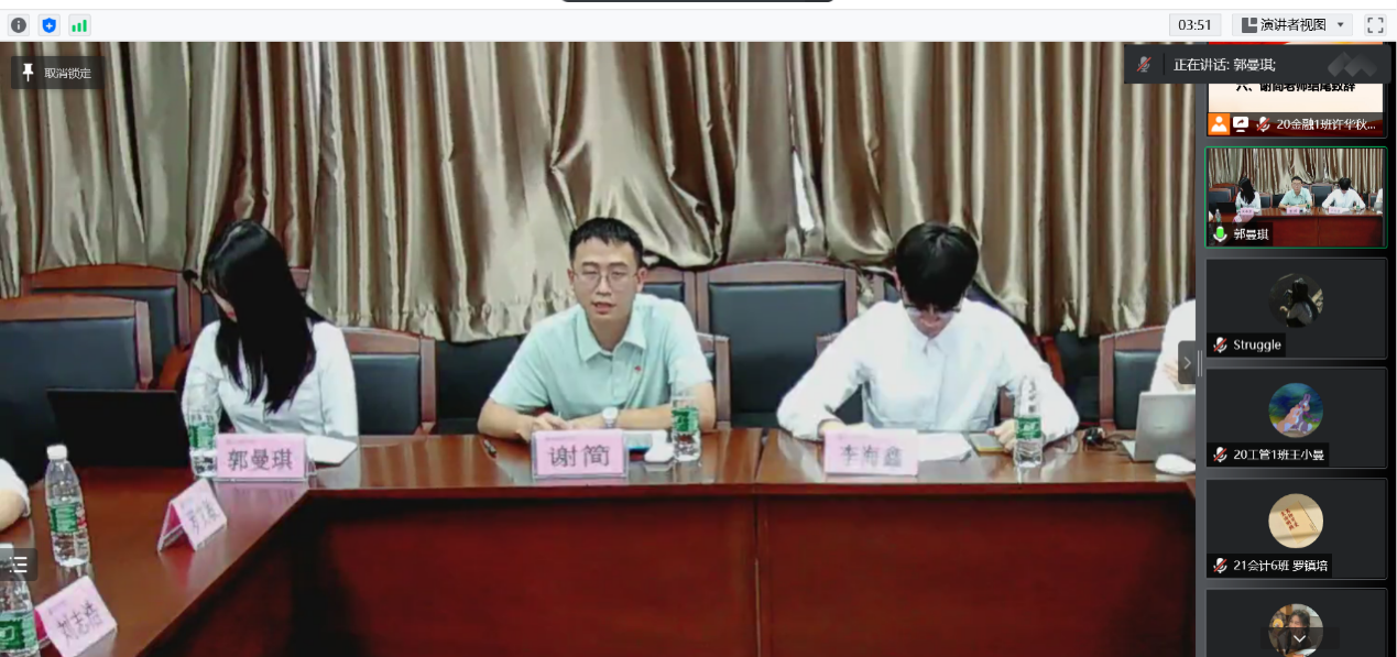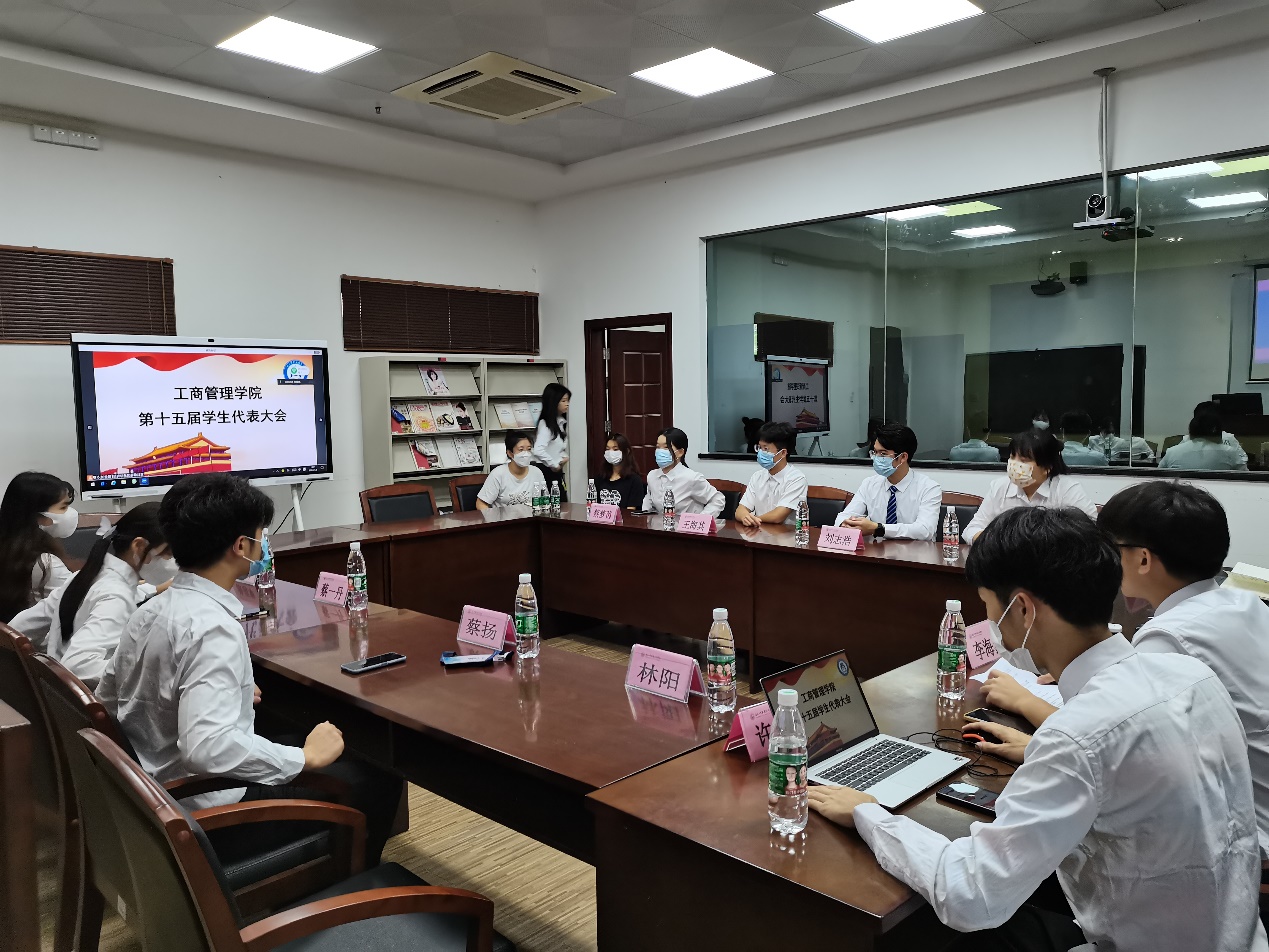 7月6日,bat365在线平台官网工商管理学院第十五届学生代表大会如期举行。受疫情影响,本次学代会采用线上、线下结合方式进行,工商管理学院党总支青年委员谢简作为学生会指导老师出席会议。