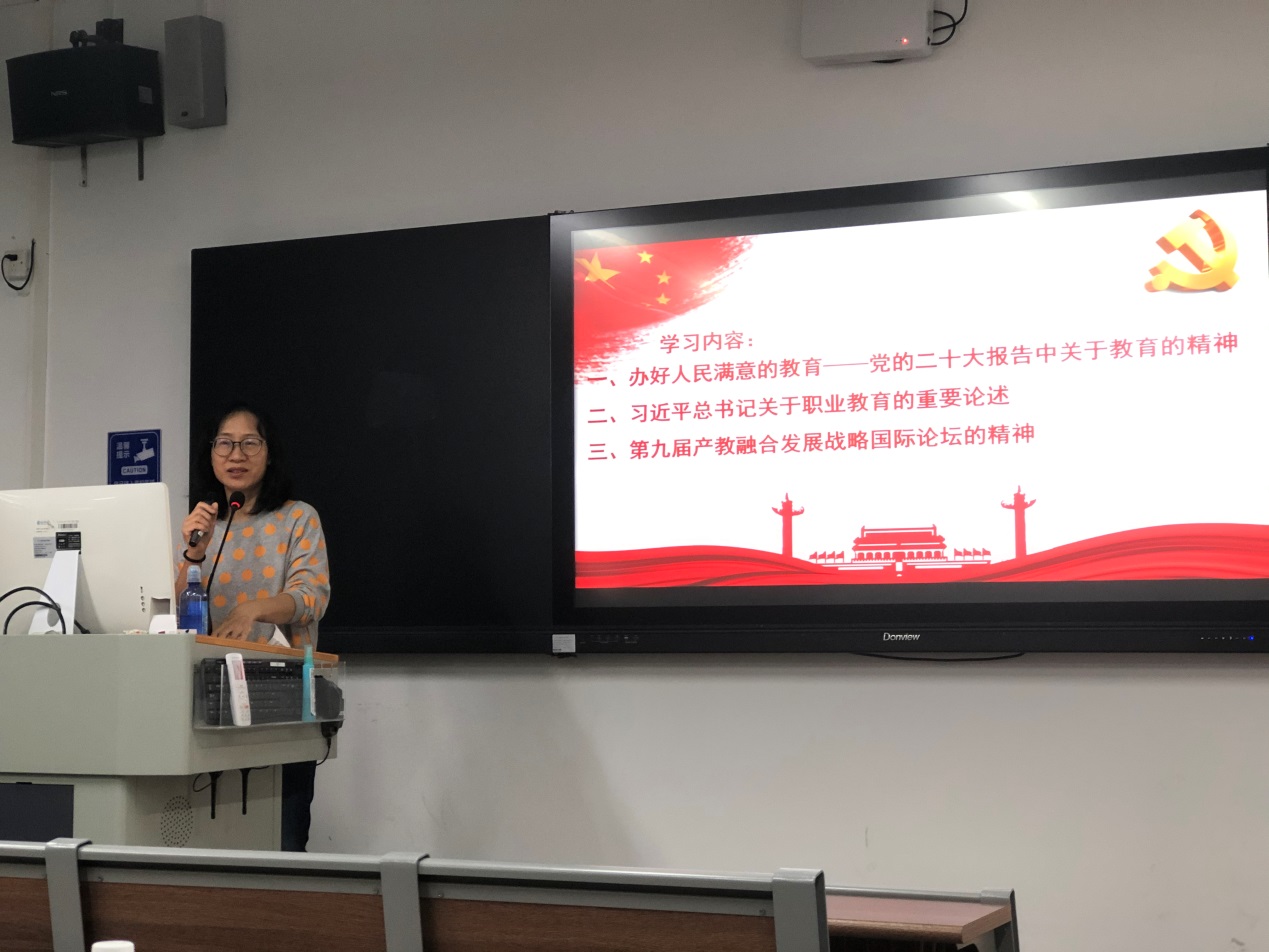 学习会上,何美贤首先组织学习“党的二十大报告中关于教育的论述”和习近平总书记关于职业教育的重要论述,以及第九届产教融合发展战略国际论坛的精神,带领大家深入理解“办好人民满意的教育”的重要意义、职业教育对促进经济发展和民生改善的重要作用、现代职业教育高质量发展的深刻内涵,再次激发全体教师的干事热情。
