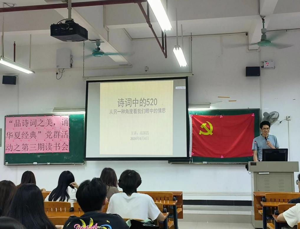总第73期:诗词中的“520”。6月4日下午,工商管理学院高国昌老师以诗词中的“520”为主题,分别从“爱意”、“思意”、“愁意”、“恨意”四个方面带领同学们一起走进经典诗词的殿堂,感受爱情诗词的魅力。同学们了解到古代诗人对情感表达方式的独特方式,也感叹到诗词中那含蓄而委婉、热情而克制的情思。诗人用寥