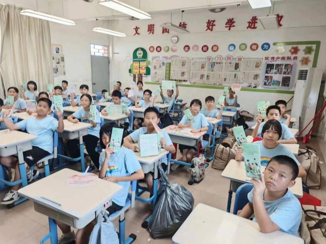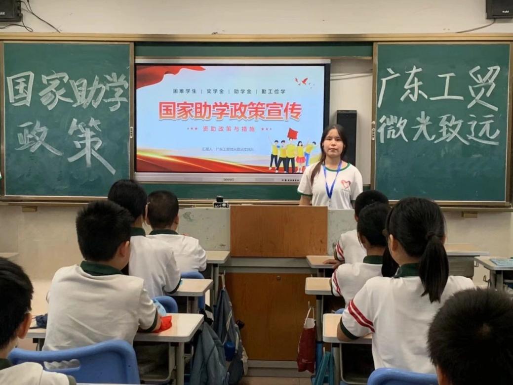 首先,队员们来到佛山市高明区合水千禧小学开展国家助学政策宣讲。队员们向学生们发放了国家助学政策宣传手册,并详细介绍了国家助学相关政策。其中,包括义务教育阶段的困难家庭生活费补助和农村义务教育学生营养改善计划,详细解读助学贷款的政策、申请条件、发放和还款流程,让孩子们对助学贷款有了基本的了解。