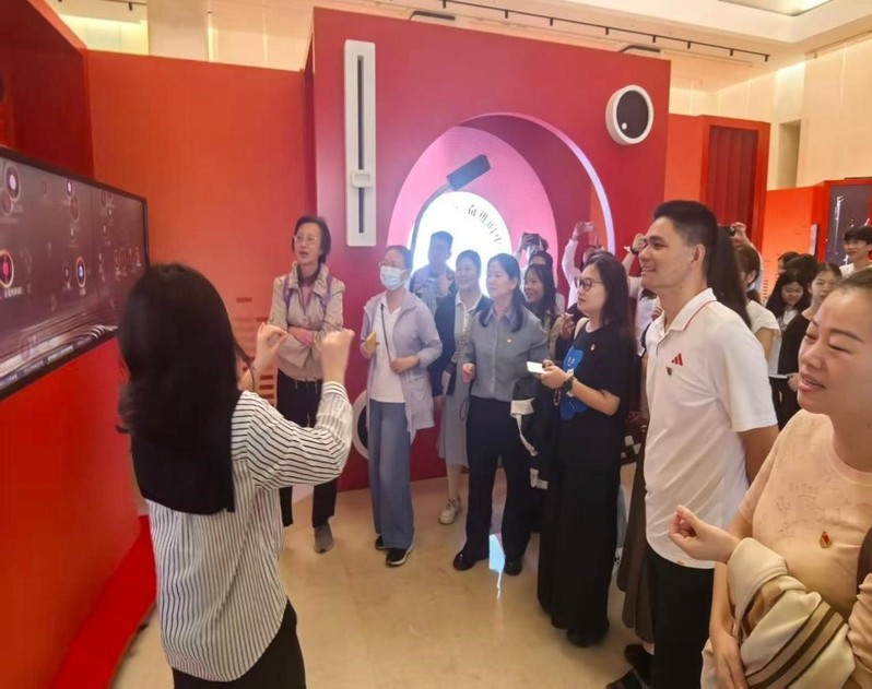 文沁阁坐落于从化凤凰山麓,以“岭南山水、中华制式”为设计底色,馆藏版本超400万册(件),是守护中华文明的“基因库”。在讲解员引导下,党员们循着“海丝文明——红色记忆——科技赋能——岭南文脉”脉络,沉浸式探访特色展区,近距离观摩海丝贸易文书、革命时期手稿等珍品,裸眼3D技术让静态文物“动态复活”,直观感受文化传承的创新活力。参观中,大家不时驻足交流、记录感悟。党员韩天瑶感言:“每一件版本都是文明的见证,既看到了历史厚度,更体会到中华文化的生生不息。”