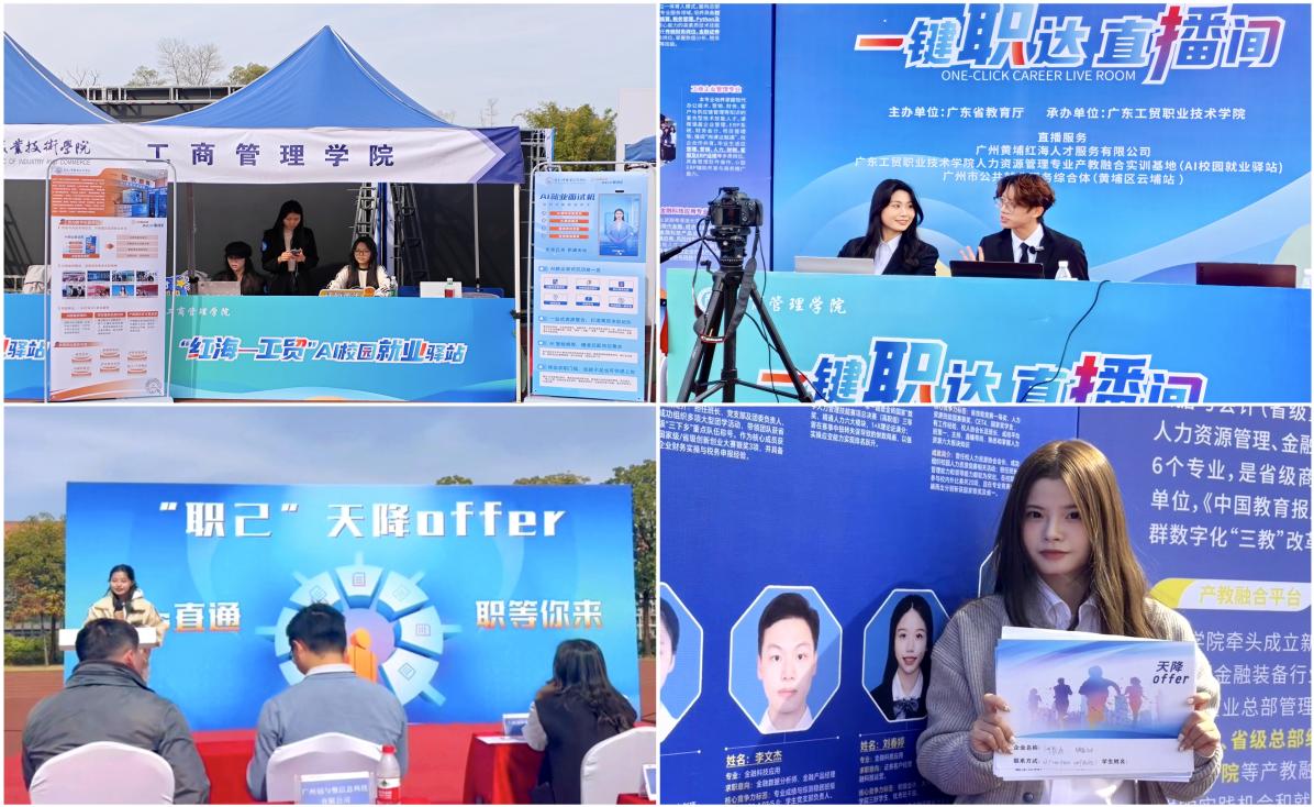 招聘会也能“云端打卡 + 线下冲刺”。工商管理学院与校企合作单位广州黄埔红海人才服务公司共建的人力资源专业产教融合实践基地暨“校园AI就业驿站”,也搬进了招聘会现场“一键直达”直播间,人力资源专业师生直播天团化身“岗位推荐官”,带领屏幕前的毕业生“云逛”企业展位,错过直播的学子还能通过回放功能“划重点”回看,求职节奏自主掌控;线下会场同样热闹,同步设立的“职己・天降offer”直通区域成为工商学子展示才华的实景舞台,多名表现突出者当场收获企业录用意向。“云端带岗 + 线下竞聘”的双轨模式为企业与求职者搭建高效对接桥梁,立体化的场景提升了求职参与感与精准度。
