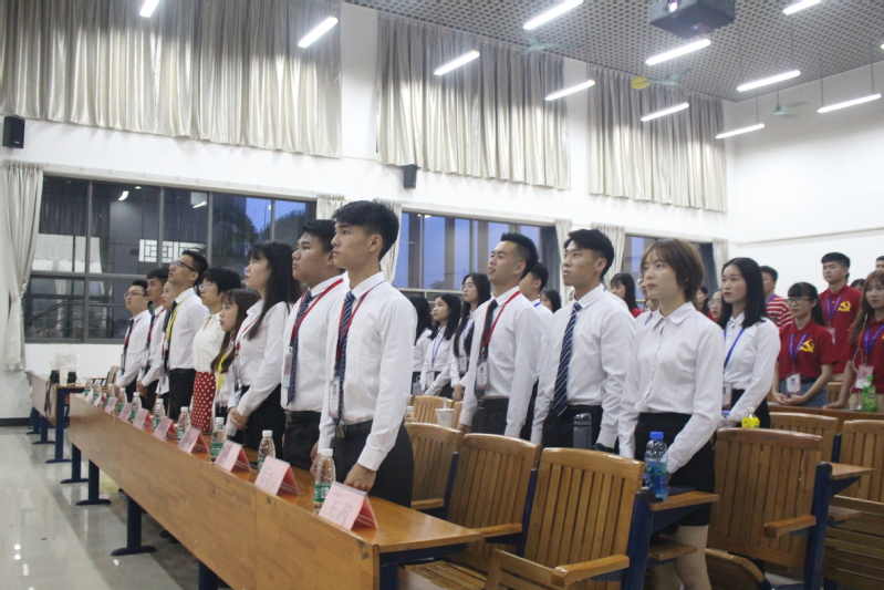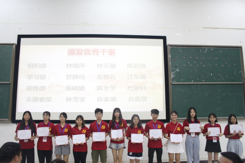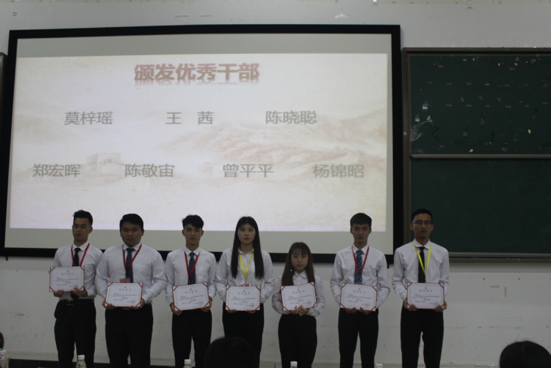 经贸党群服务中心已经携手走过了六个年头,每一届的学生干部都对组织注入了满腔热情,回顾这些日子,有欢笑,有汗水,有收获,亦有坎坷相随。当然更多的是见证了学生的成长。今天在这里,18级干事从17级的手里接过大旗,他们将带着老干部的重托继续前行。会议在庄严的国歌声中拉开了序幕,视频播放回忆了这一年来所举办过的活动,包括经贸演说家、井盖涂鸦、党章知识竞赛、荧光夜跑、海峡两岸师生交流会等。17级干部代表陈晓聪做了年度工作总结,指出了工作的不足与成绩,鼓励18级干部在工作中再接再厉。紧接着是17级干部语重心长的叮嘱与祝福以及18级新晋干部对往后工作的承诺,18级新任干部表示,在组织里得到了很多锻炼的机会,在党群服务中心的日子里过的很充实,有很多的收获和感动,很庆幸自己加入了这个温暖的大家庭,以后的工作会继续加油、坚持到底!吴海英进行了总结发言,她表达了对党群服务中心的感动,感谢17级干部的付出,期待18级干部做出更好的成绩,组织是让大家得到锻炼的一个平台,希望同学们能够协调好学习和工作的时间,团结一致,端正态度,要立志做大事,不要立志做大官,系好人生的第一粒扣子。最后进行了优秀干部、优秀干事、服务之星的颁奖典礼,新旧干部进行了工作交接仪式