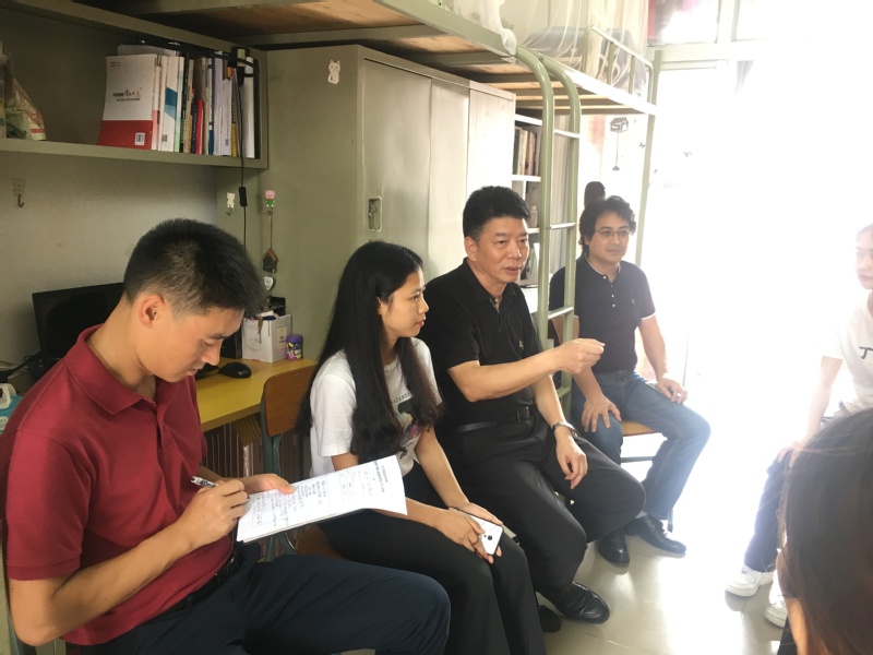为了贯彻落实省委教育工委《学校领导干部深入基层联系学生工作的实施方案》的文件精神,推进学校立德树人根本任务。2019年6月14日,学校党委书记汤才到白云校区子勤书院5号楼815宿舍走访,一同走访的有学校党办主任黄雄志,经济贸易学院党总支副书记(主持工作)王坤明,党总支副书记龚云。