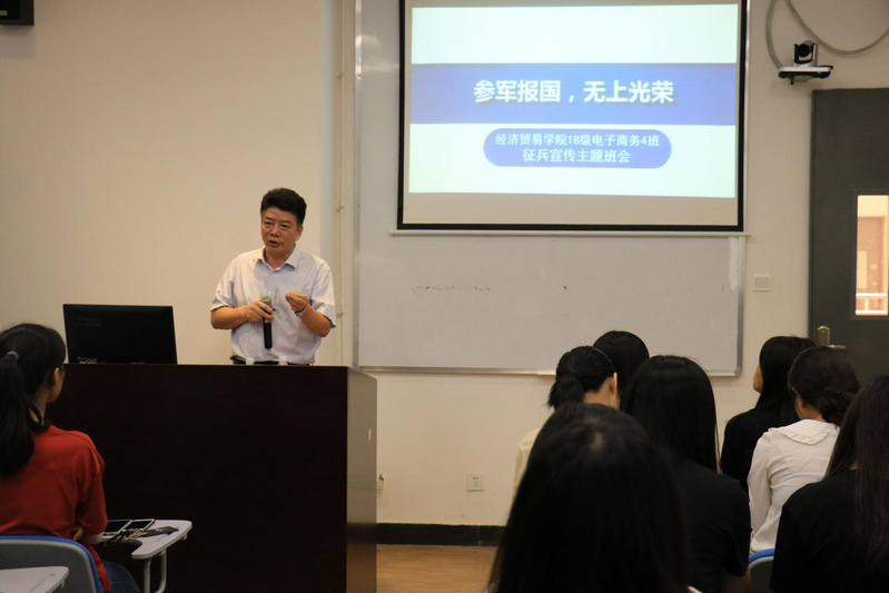 为贯彻落实中央和省、学校的相关文件精神,积极开展学校领导深入基层联系学生工作。学校党委书记汤才2019年6月15日参加了经济贸易学院18级电子商务4班在教学楼一区215教室举行的“参军报国,无上光荣”的征兵宣传主题班会。党委办公室主任黄雄志、经济贸易学院党支副书记(主持工作)王坤明、党总支副书记龚云,以及18级电子商务4班的全体同学出席了本次主题班会,班会由班主任陶智祥老师主持。
