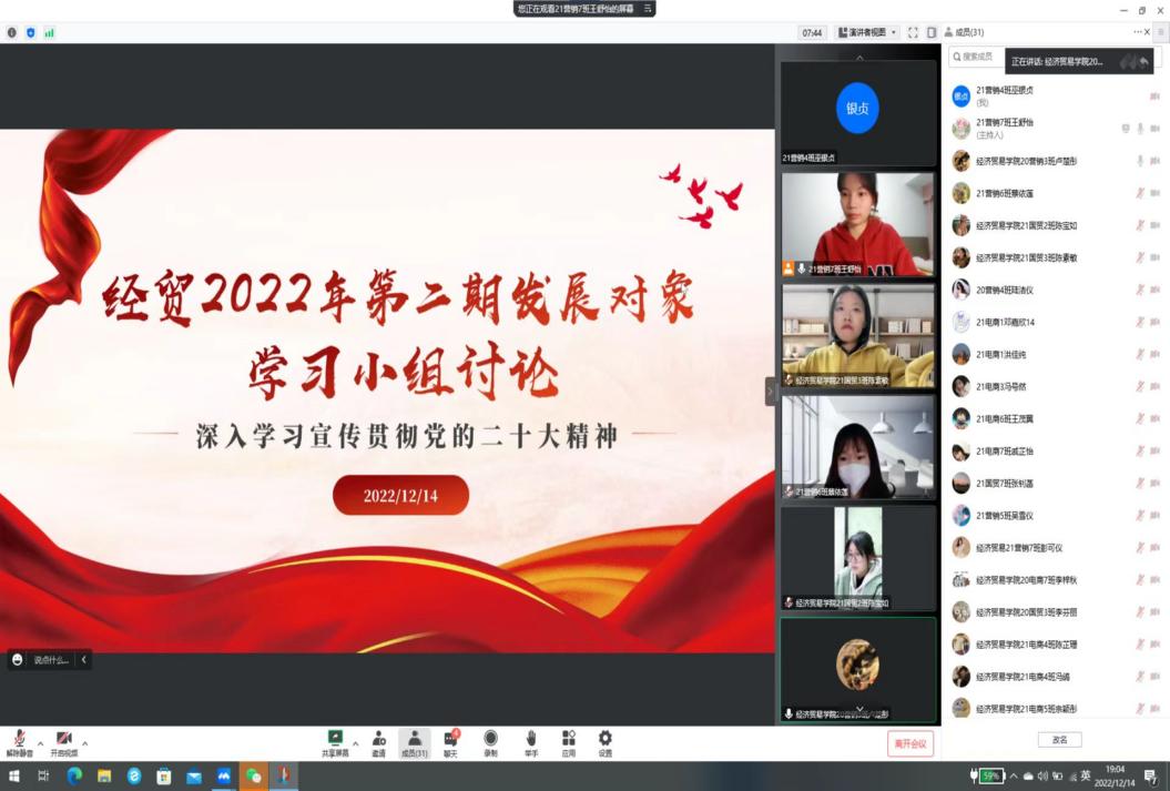 为了深入学习贯彻党的二十大精神,进一步加强对发展对象的培养教育,根据学校党委组织部的统一部署,经贸学院2022年第二期发展对象培训班于12月14日召开了深入学习宣传贯彻党的二十大精神学习小组讨论会。