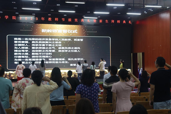 “我是一名光荣的经济贸易学院人民教师,我宣誓......”,由邱秀芳院长领誓,全体新教师大声诵读属于经贸学院教师的专属誓词,“爱党爱国、立德树人、为人师表、敬业笃学、薪传火继、行廉有耻”,老教师与新教师们一同重温了誓词,作出了承诺。