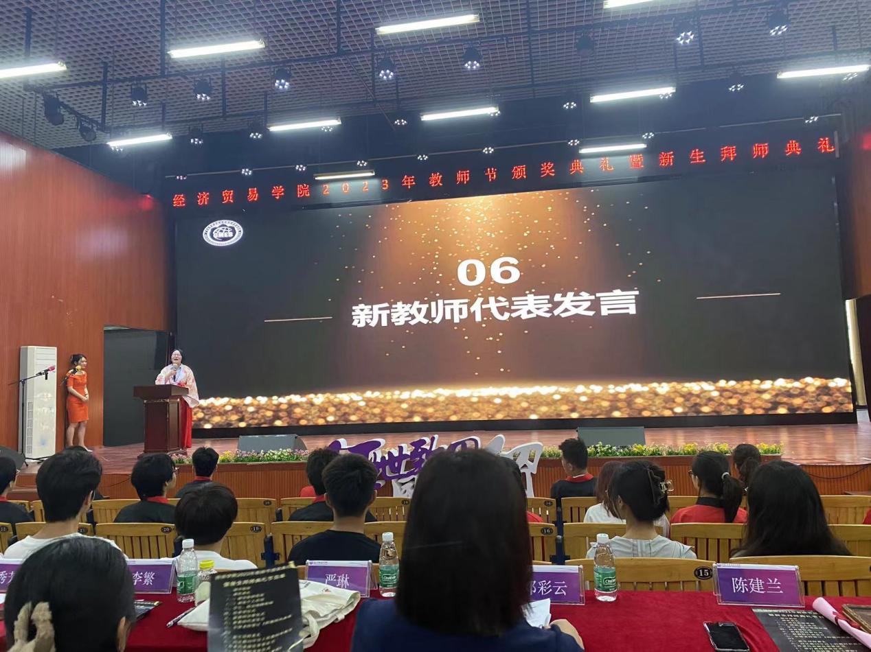 宣誓完毕后,新教师代表、来自跨境电子专业的陈建兰博士代表发言,她回顾了过去在研究岗位上的经验,并表示,很荣幸能加入经贸大家庭,希望未来能为经贸贡献自己的一份力量。