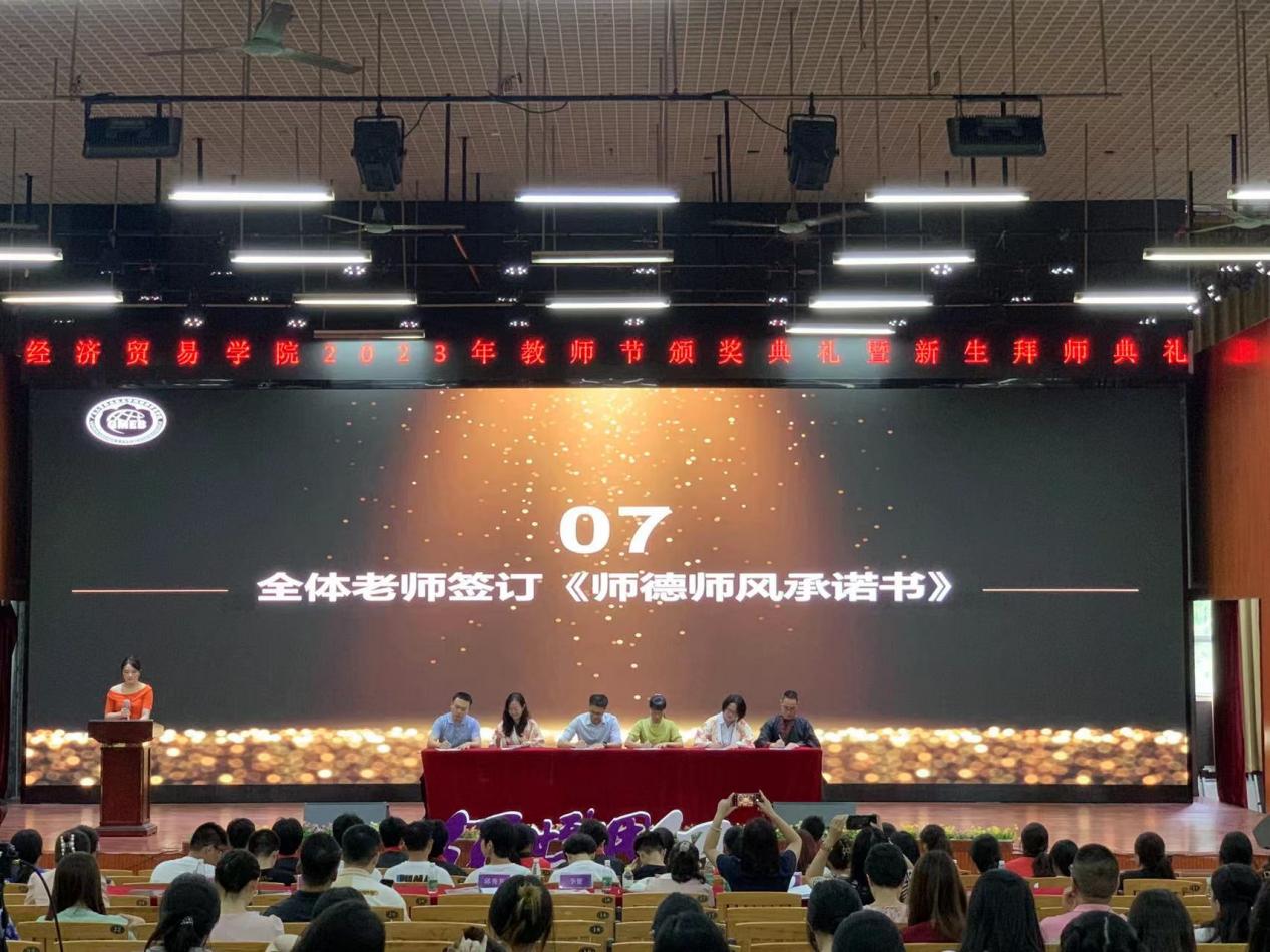 典礼进行到第七项,全体教师签订《师德师风承诺书》和《意识形态工作责任书》。师德师风是教师“身正为范”的根本,《师德师风承诺书》的签订,代表了经贸学院全体教师的真心、决心和信心。牢固树立良好师德师风,是经贸学院一贯的优良传统。新时代新征程经贸学院将继续引导广大教师坚定理想信念,陶冶道德情操、涵养扎实学识、勤修仁爱之心,做“四有”好老师。
