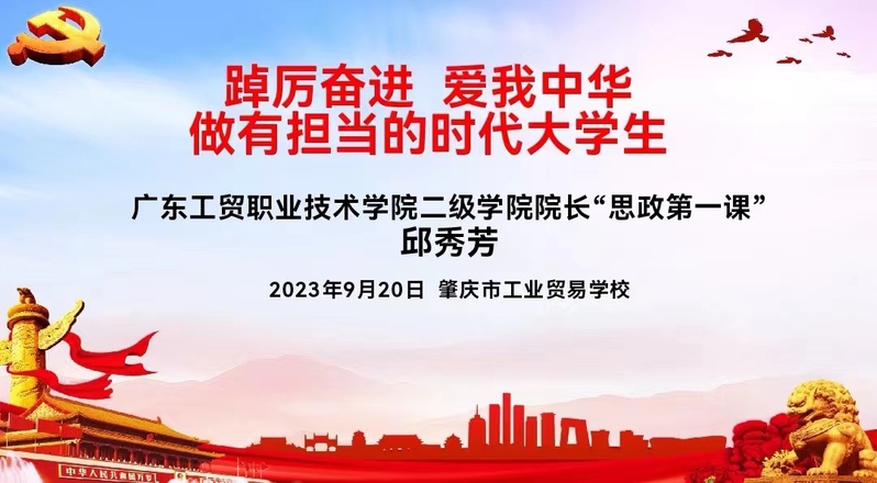 为培养学生爱国情怀,鼓励学生以实现中华民族伟大复兴为己任,踔厉奋进,9月20日,经济贸易学院院长邱秀芳在肇庆市工业贸易学校为bat365在线平台官网·肇庆市工业贸易学校中高职贯通培养2023级高职新生开讲题为“踔厉奋进,爱我中华做有担当的时代大学生”的“思政第一课”。