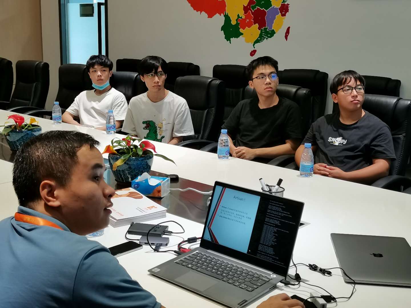 在此次参观学习中,欢创集团的老板助理蒋咪介绍了公司的发展历程、公司的主营业务和即将与学院双创实践中心合作的平台开发项目。接着公司的技术总监梁锡相介绍了此次合作项目的开发需求和所需要掌握的相关技术内容,推荐了相关的学习资料,并叮嘱学生们在微信群里有不懂的就要大胆提问,这样才能更好更快地完成项目开发任务,也能够提高学生们的技术水平。