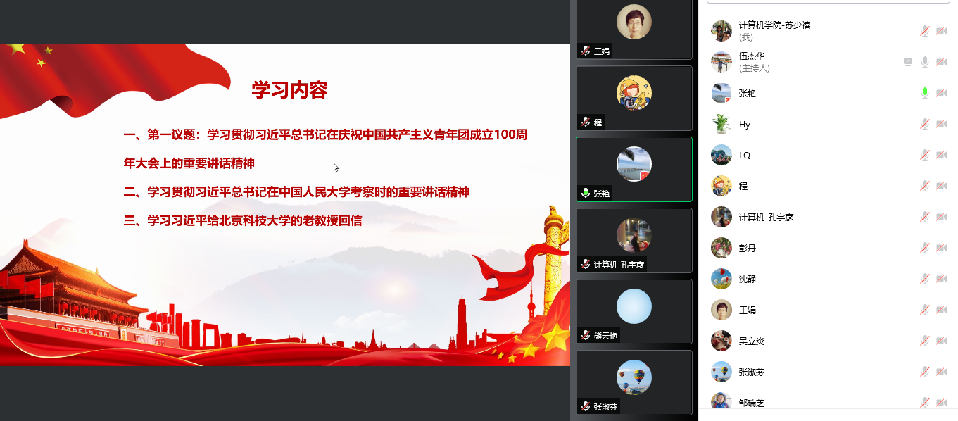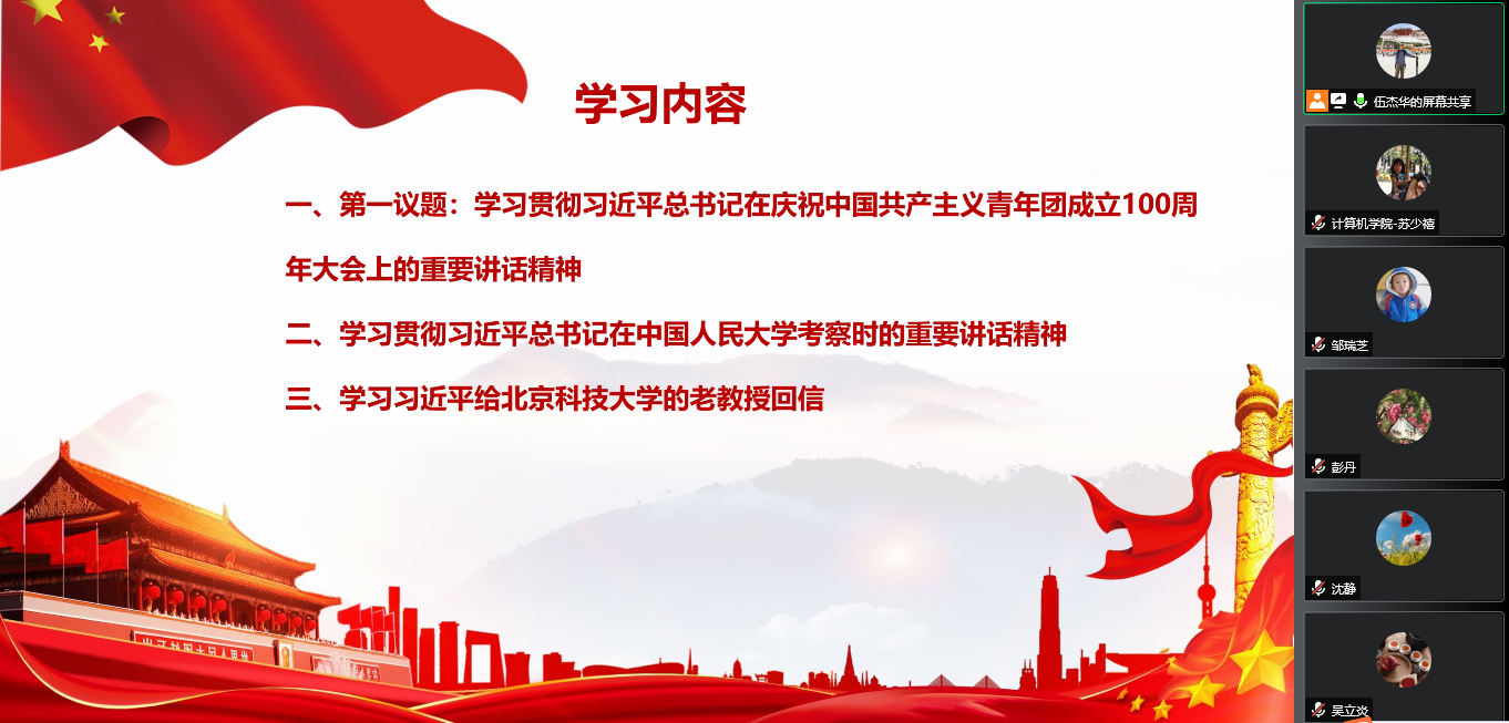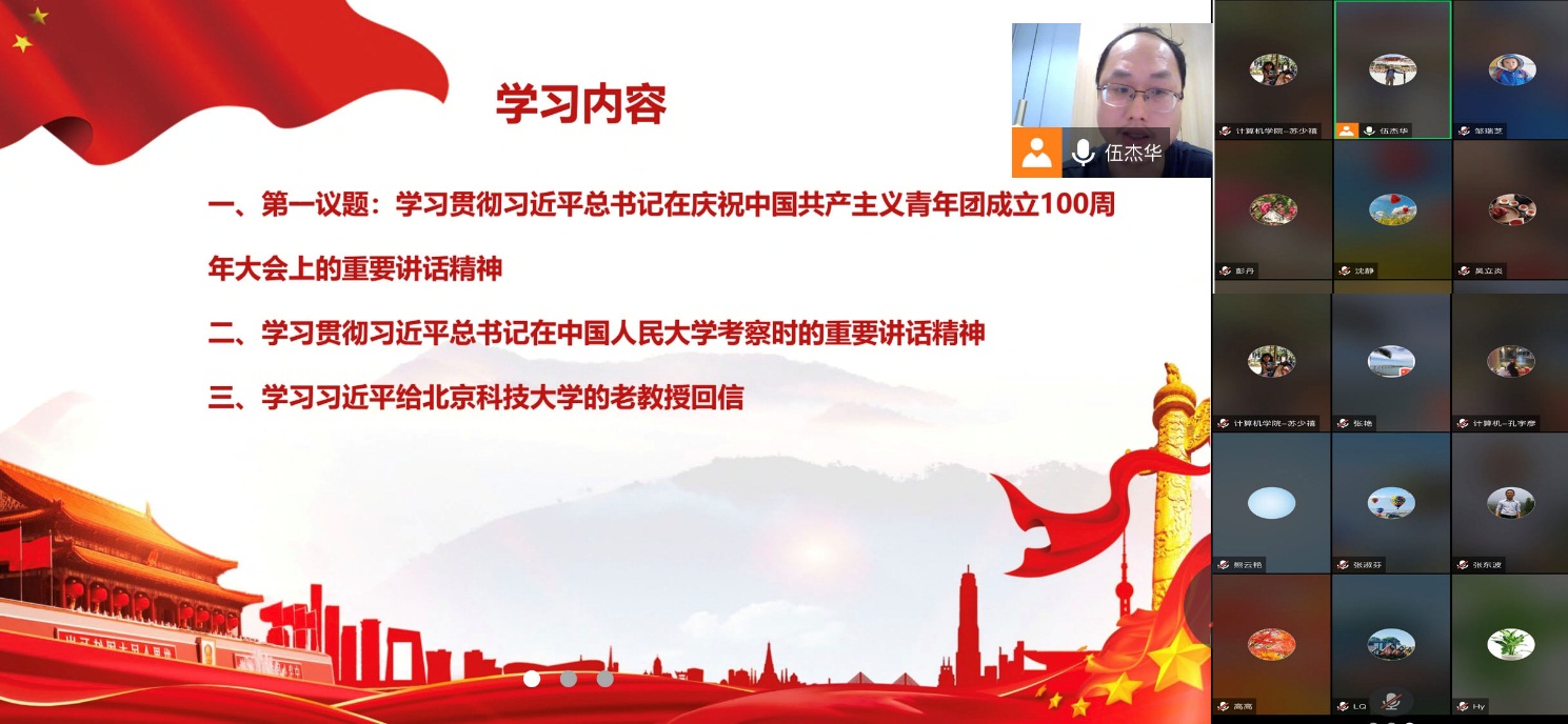 2022年5月12日,计算机学院教师第二党支部按照学校的理论学习要求及学院党总支的部署,结合疫情防控需要,组织支部所有党员以线上的方式召开了政治理论学习会议,学习贯彻习近平总书记在庆祝中国共产主义青年团成立100周年大会上的重要讲话精神、习近平总书记在中国人民大学考察时的重要讲话精神、习近平总书记给北京科技大学老教授回信的重要精神等,深刻领会习近平总书记重要讲话精神的重大意义,增强忠诚拥护“两个确立”、心怀“国之大者”,善谋“国之大计、党之大计”,切实担负起“为党育人、为国育才”的神圣使命。