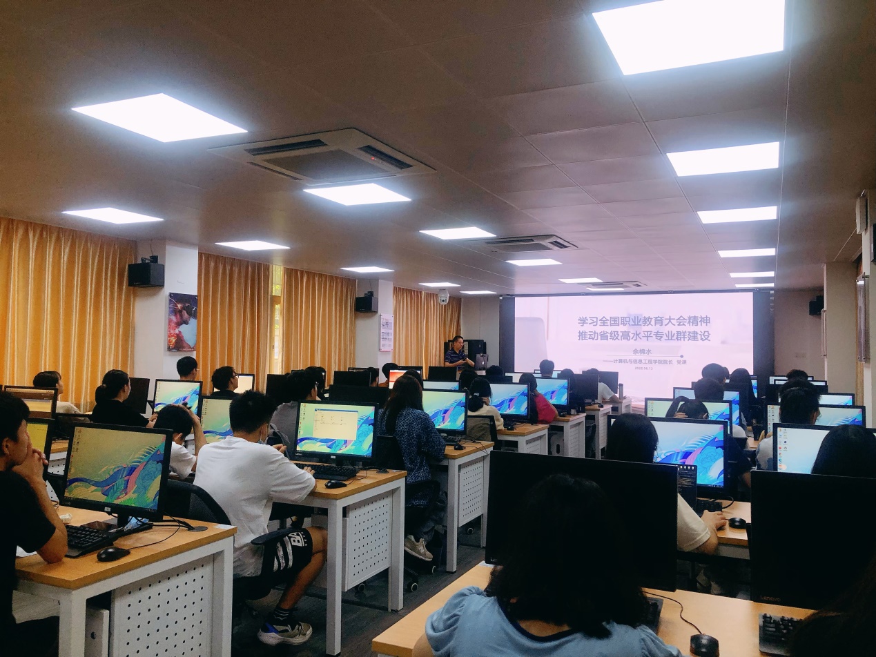 为深入学习领会全国职业教育大会精神,教育引导广大青年学生树理想、增信念、长志气,争当先锋。6月13日下午,计算机学院院长余棉水在天河校区实训楼202为2021级学生上了一堂以“学习全国职业教育大会精神,推动省级高水平专业群建设”为主题的专题党课,深入阐释全国职业教育大会精神的重大意义和丰富内涵,并结合学院高水平专业建设工作实际,对学生专业学习、职业规划提出要求和建议。