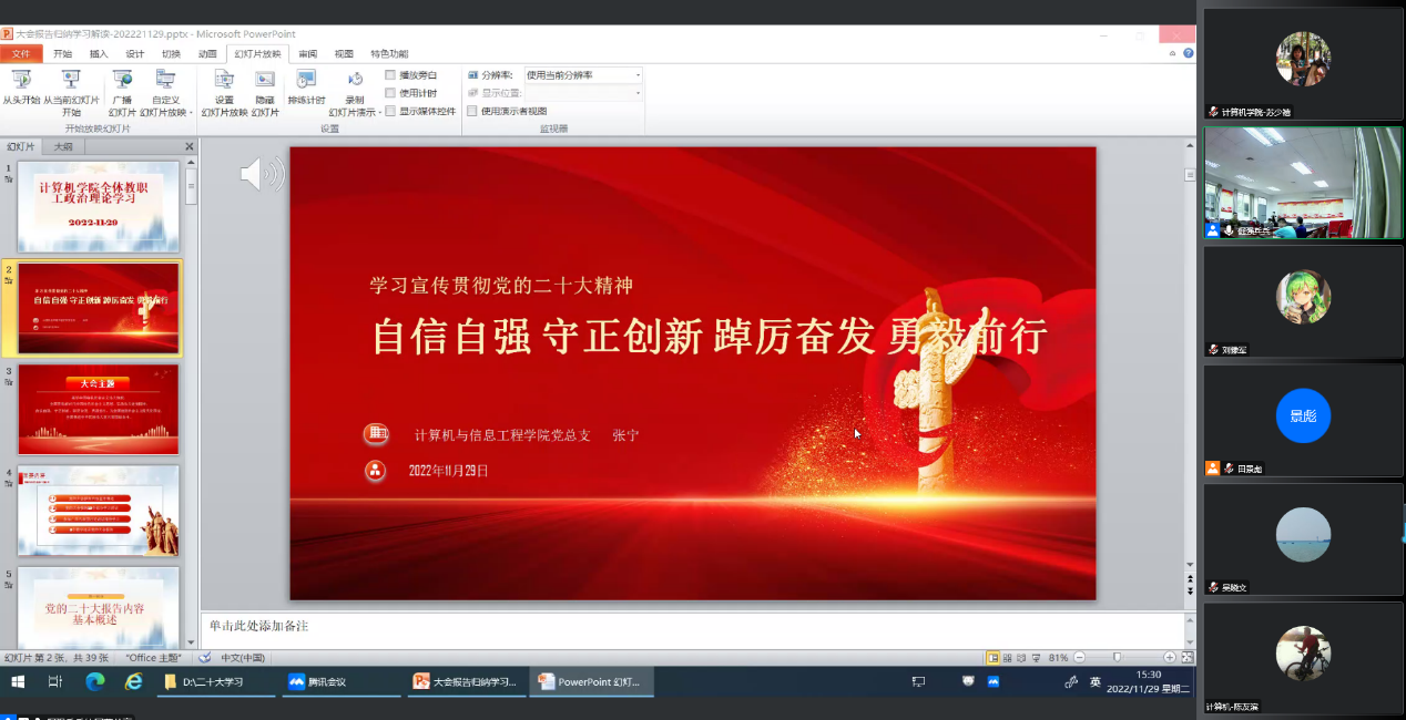 为深刻认识党的二十大的重大意义,切实推进党的二十大精神进校园、进课堂、进头脑,将思想和行动统一到党的二十大精神上来。1129日下午,学校党的二十大精神宣讲团二级学院书记宣讲队成员、计算机学院党总支书记张宁为计算机学院全体教职工开展了一场题为《自信自强 守正创新 踔厉奋发 勇毅前行》的深入学习宣传贯彻党的二十大精神宣讲会。宣讲会由学院党总支组织委员代启兵主持,以线上线下相结合的方式进行。
