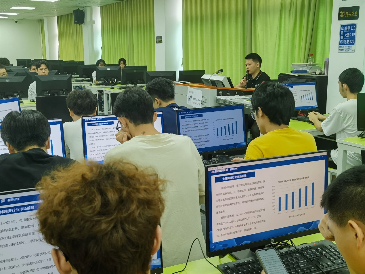 为进一步拓宽学生就业渠道,促进学生高质量就业,6月14日,计算机学院邀请了杭州安恒信息技术股份有限公司进校开展校园招聘宣讲会。杭州安恒信息技术股份有限公司是一家专注于信息安全领域的高科技企业,该公司华南区王经理表示公司将立足广州白云区,积极与学校开展校企合作,联合培养信息安全专业技术人才,不断深化产教融合、产学合作,推动职业教育高质量发展,现拟招聘一批安全护网实习生,此次公司可提供优质岗位数36个,涵盖行销实习生、安服实习生(数据安全)、安全运营实习生、网络安全工程师等不同岗位。在宣讲会上介绍了公司的发展历程、现况、理念、组织机构、产品成果、市场规模等方面的情况,展示了公司在信息安全行业的领先地位和优势。他还向同学们详细介绍了公司目前拟招聘的一批安全护网实习生的岗位要求、工作内容、薪酬福利、入职培训、食宿条件等方面的信息,并就同学们关心的薪酬福利、入职培训、食宿条件等问题作了耐心的解答。宣讲会现场气氛热烈,同学们积极参与提问,郑工程师也一一作了耐心的解答,学生们积极投递了简历,并与公司宣讲人员郑大华工程师进行了沟通,互留了联系方式。