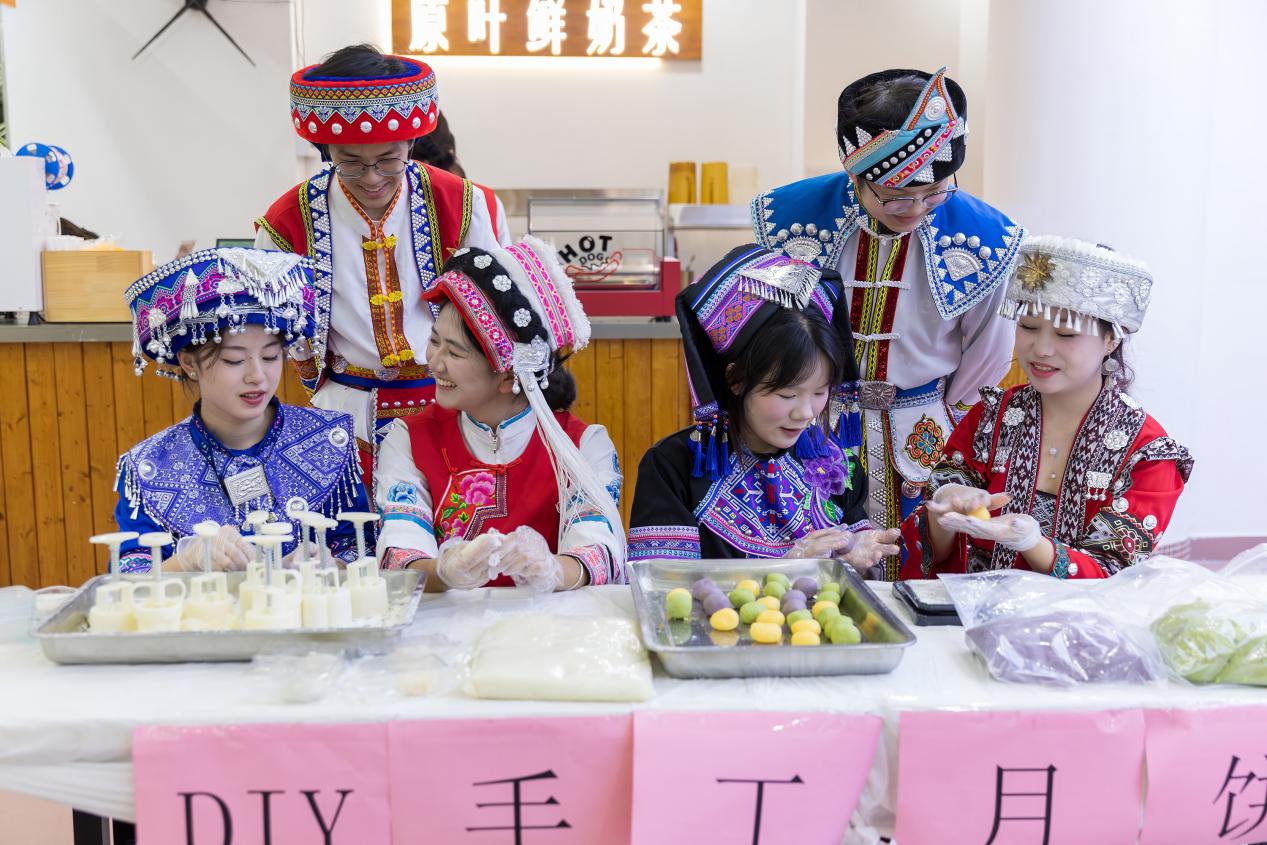 少数民族学生一起制作月饼
