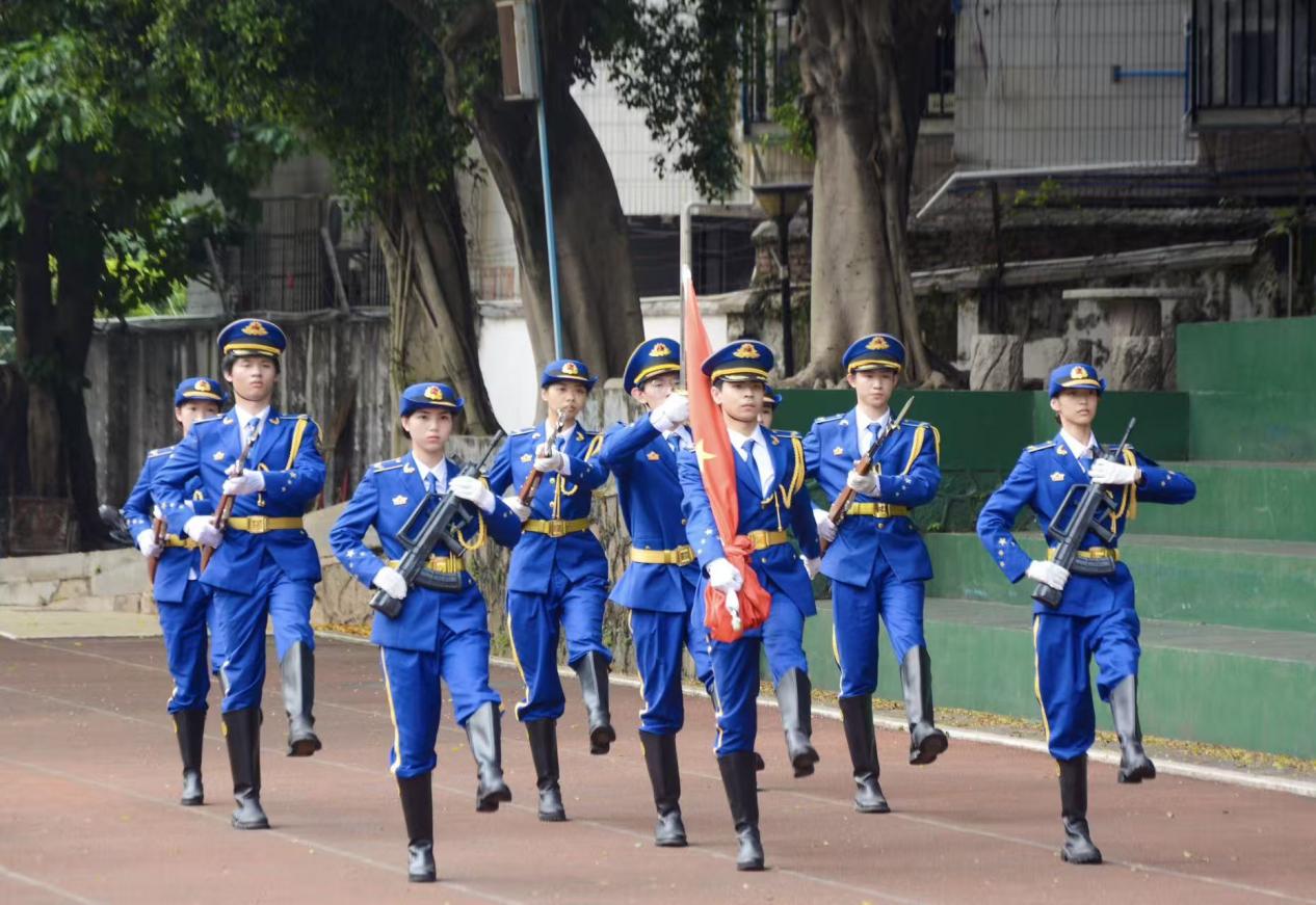 清晨的校园,朝阳初升,气氛庄重。英姿飒爽的国旗护卫队队员迈着铿锵有力的步伐,护卫着鲜艳的五星红旗走向升旗台。他们坚定的目光、整齐的动作,彰显出新时代青年昂扬向上的精神风貌。