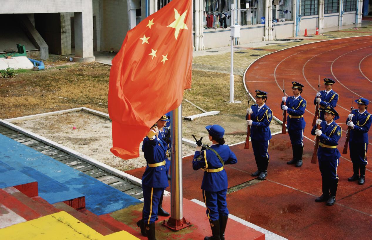 在庄严的氛围中,大会拉开帷幕。伴随着雄壮的《义勇军进行曲》,鲜艳的五星红旗冉冉升起,全体师生与承训教官肃立行注目礼,嘹亮的歌声回荡在校园上空,爱国情怀与青春热血在这一刻同频共振。