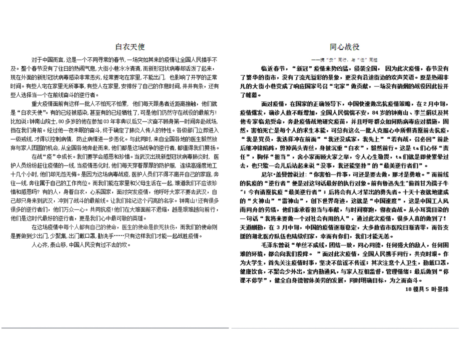 2020年的春天以特别的方式开启,注定了这是一个不同寻常的春天。严峻的新型冠状病毒感染的肺炎疫情,牵动着全国人民的心,也让大家在这个寒假过得不同以往。在这场没有硝烟的战争中,作为一名大学生的我们能做什么?我们虽然可能不能像白衣天使那样与武汉人民一起战斗在抗击疫情的第一线,但确实可以用手中的笔,用热腾的心,参与到“抗击疫情”的战斗中。