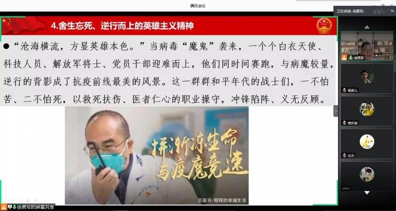 7月13日晚上20点,机电工程学院党总支副书记、院长徐勇军同志线上为机电工程学院党总支第34期入党积极分子党课培训班学员讲授了一堂以“疫情防控孕育伟大‘抗疫精神’及时代启示”为专题的党课。