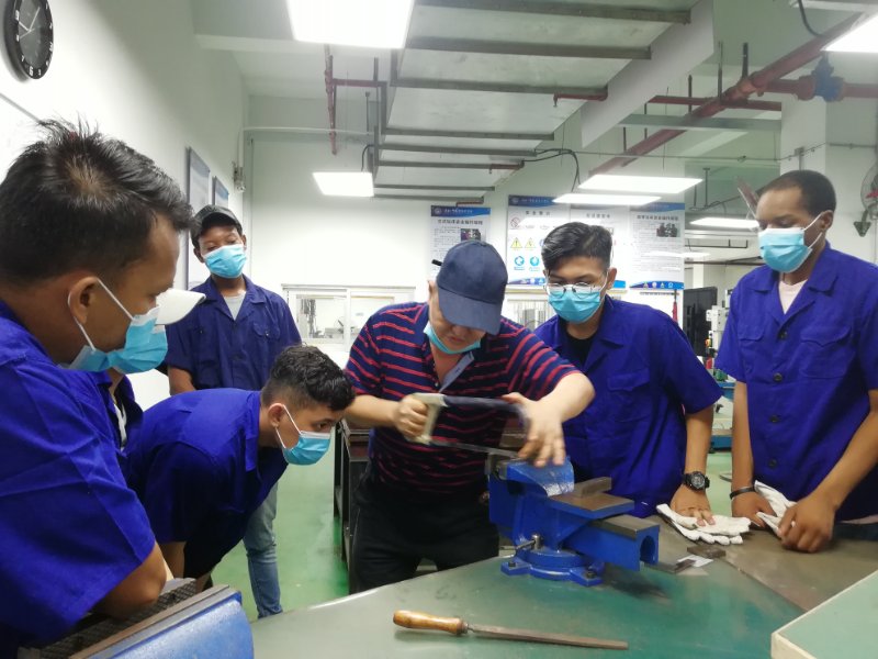 根据实训课程安排,留学生在本学期需要进行车床工件、铣床工件、钳工工件加工实训。期间,指导老师循序渐进的教留学生制作工件,同学们认真观摩、记录笔记。在操作过程中,他们严格按照流程,做到有不懂就问,同学之间相互讨论、学习,致力于制作完美工件,践行精益求精的工匠精神。