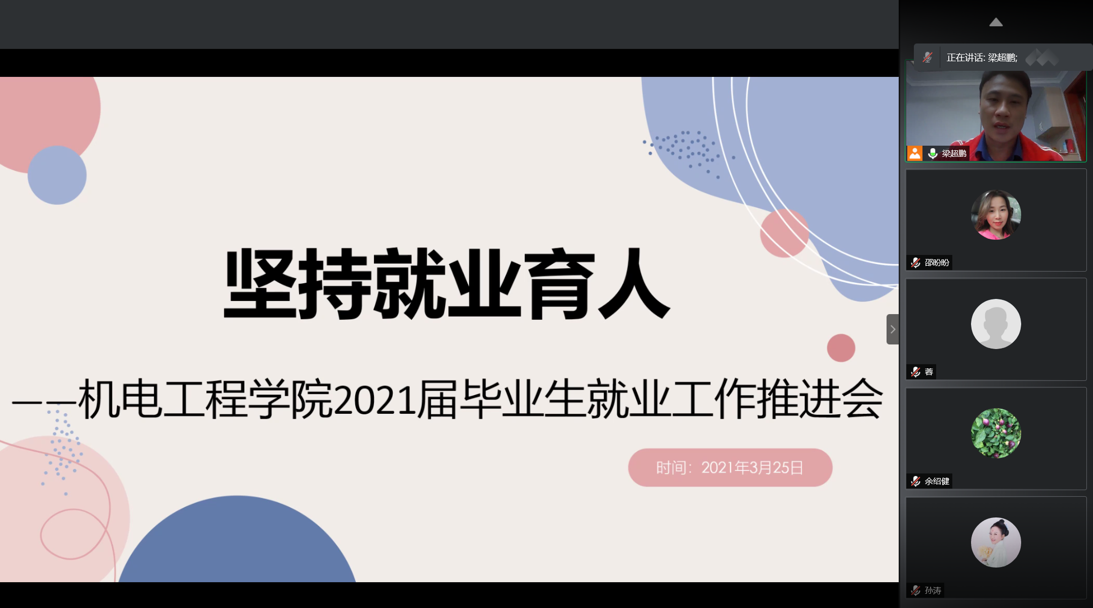 3月25日,机电工程学院召开了2021届毕业生就业工作推进会。机电工程学院党总支书记邵超城、院长徐勇军、党总支副书记梁超鹏、副院长丘永亮、游凯和2021届全体毕业设计指导老师及毕业班班主任、辅导员参加了此次会议。会议由梁超鹏主持。