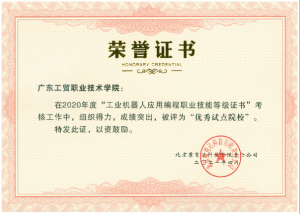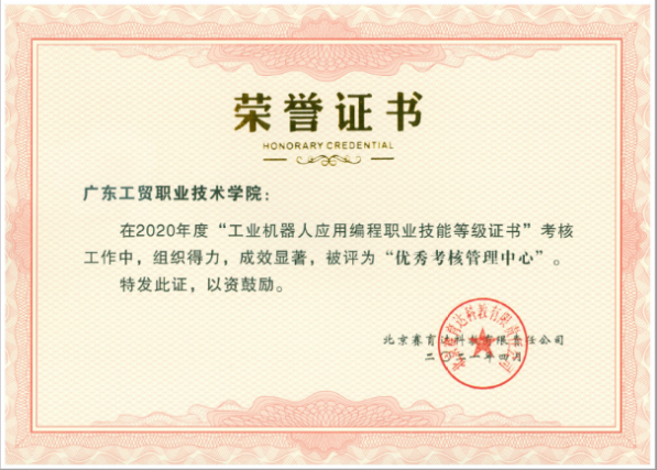 在推进1+X证书制度试点任务过程中,365官网去年以广东省管理中心为任,积极完成本校的培训考核任务,并积极联系其他兄弟院校组织培训和考核,去年年底共考核考生900人次。赛育达公司在推荐遴选、综合考察的基础上,365官网被评为2020年度工业机器人应用编程1+X证书制度试点工作优秀考核管理中心和优秀试点院校,机电工程学院邵超城被评为突出贡献专家、周佳杰被评为先进工作者、孙涛、王锐斌等被评为优秀考核师。