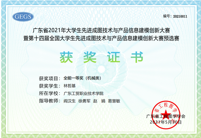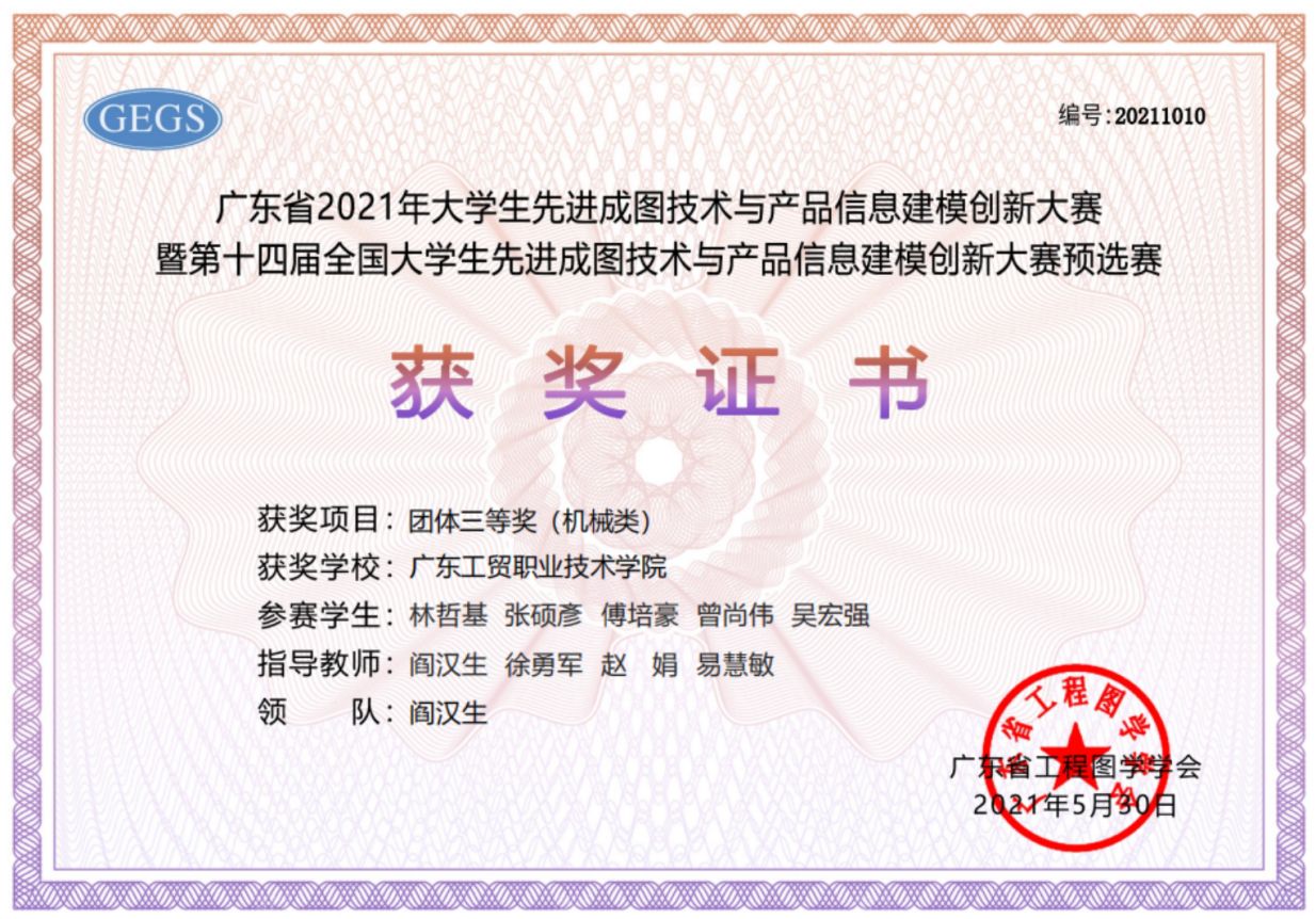 2021年5月29日,第十四届“高教杯”全国大学生先进成图技术与产品信息建模创新大赛广东省预选赛采取线上形式举行。365官网机电工程学院由林哲基、张硕彥、傅培豪、曾尚伟和吴宏强5位同学组成团队参加了比赛(指导教师:阎汉生、徐勇军、赵娟、易慧敏)。参加本次比赛的有华工、华农、广工等重点本科院校,还有市工贸技师、肇庆技师等国家重点中专,也有顺职院、机电职院等一流高职,500多名选手不分组别,同台竞技。经过激烈拼搏,365官网代表队从机械类370多名选手中脱颖而出,荣获个人全能一等奖1项、二等奖1项、三等奖2项和获团体三等奖的好成绩,并获得参加7月份全国总决赛的资格。