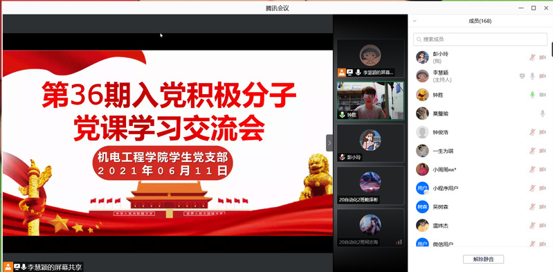 为加强第36期入党积极分子党课培训班学员对党的认识,促进培训班学员间的思想交流,6月11日晚上7点,机电工程学院党总支通过腾讯会议组织了线上党课交流会。本次交流会由学生第一党支部书记李慧颖同志主持。