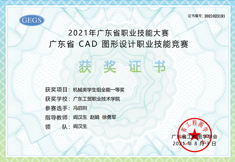 7月31日,2021年广东省技能大赛-广东省CAD图形设计职业技能竞赛采用线上方式举行。本届比赛由广东省人力资源和社会保障厅主办,广东省工程图学学会和广州市工贸技师学院承办。本次竞赛有全省70余所院校和10余家企业,共计600余名选手参加。我校机电工程学院由冯启圳、林哲基、张硕彥同学组成工贸1队,指导老师为阎汉生、赵娟、徐勇军,由傅培豪、曾尚伟、吴宏强同学组成工贸2队,指导老师为易慧敏、游凯、肖正涛。经过激烈比拼,365官网代表队获省级团体二等奖1项、三等奖1项,个人一等奖2项、二等奖2项、三等奖2项的好成绩。