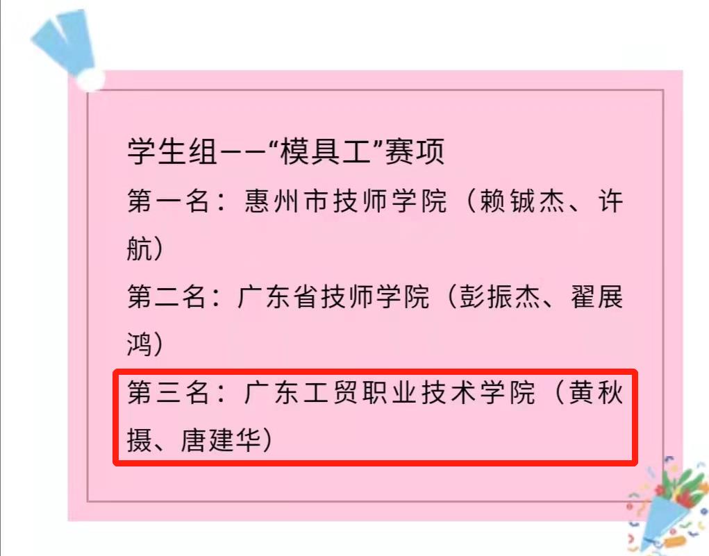 10月7-10日,全国一类职业技能大赛——2021年第四届全国智能制造应用技术技能大赛广东省选拔赛在惠州技师学院举行,来自全省32支参赛队伍参与了选拔赛,我院选手黄秋摄、唐建华在模具工赛项中沉着应试、进过了多轮角逐,脱颖而出获得了全国总结赛的入场券(指导团队:宋显文、蔡学瑜)。