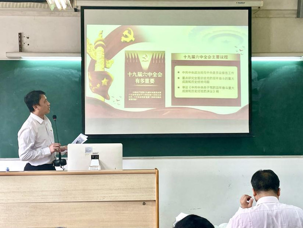 机电工程学院党总支副书记梁超鹏带领全体党员同志学习回顾改革开放以来历次六中全会会议决议,强调历次六中全会全面阐释中国共产党立志于中华民族千秋伟业,百年恰是风华正茂,并全面传达学习中国共产党第十九届中央委员会第六次会议会议内容。中国共产党第十九届中央委员会第六次全体会议最重要的成果是审议通过了《中共中央关于党的百年奋斗重大成就和历史经验的决议》,全体教师党员要把学习贯彻习近平总书记重要讲话和全会精神作为当前和今后一个时期的重大政治任务,深入学习领会,把握精神实质,切实把思想和行动统一到党中央重大决策部署上来,奋力开创新时代学院各项事业高质量发展新局面。