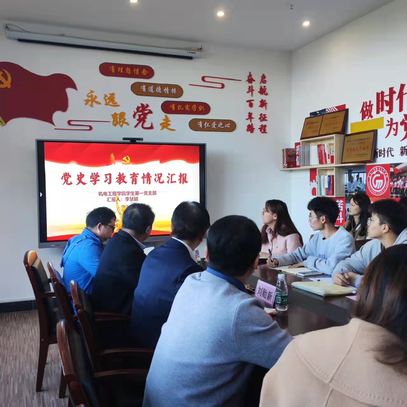 机电工程学院党总支书记邵超城首先介绍了本次调研的目的,机电工程学院学生第一党支部书记李慧颖向与会领导介绍了支部党员构成,汇报了支部党员党史学习教育情况、开展革命传统教育情况、开展“我为群众办实事”情况和支部特色活动。