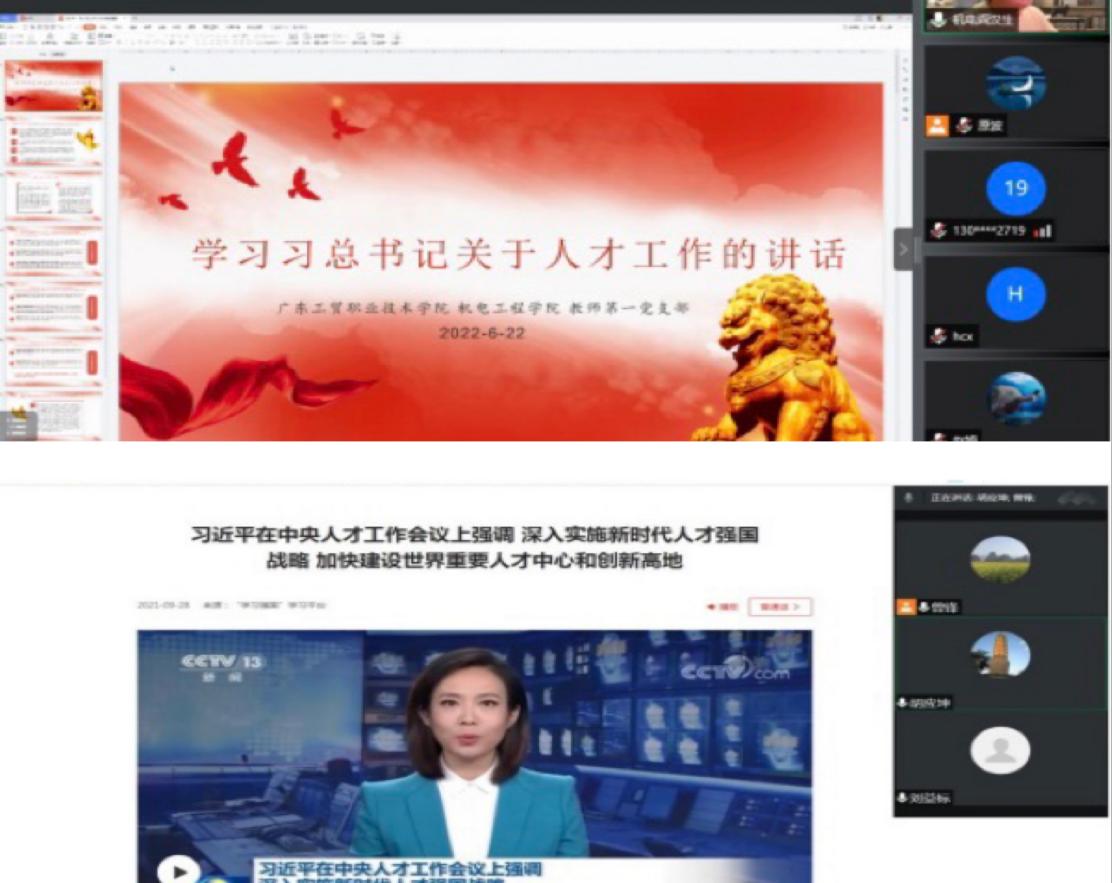为深入学习贯彻习近平总书记在中央人才工作会议上的重要讲话精神和广东省第十三次党代会精神,机电工程学院党总支、教师党支部和学生党支部于6月23日分别通过线上和线下相结合的形式召开专题学习研讨会,会议由机电工程学院党总支书记邵超城主持。