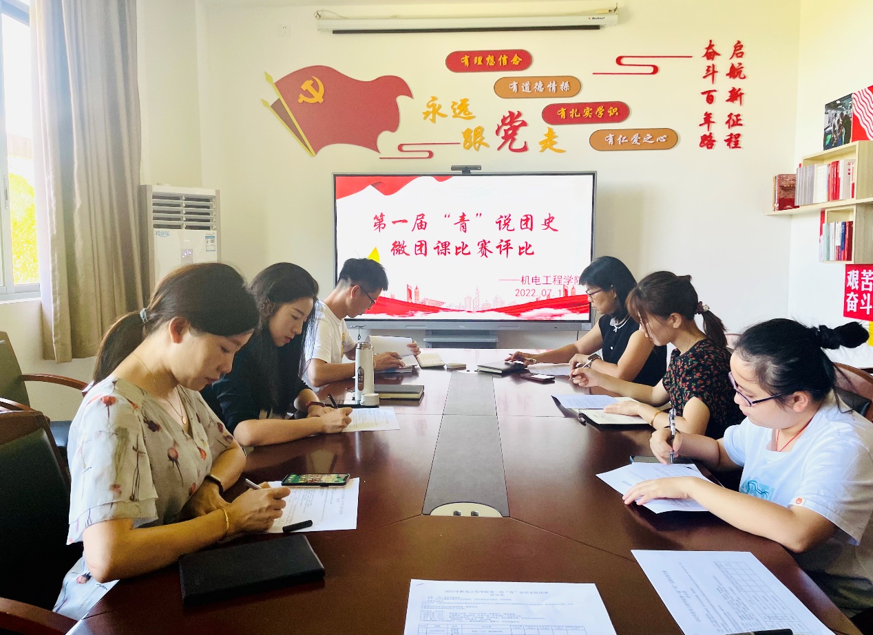 为了喜迎二十大的胜利召开和庆祝共青团建立100周年,激发共青团员传承奋斗精神、建功新时代,以“喜迎二十大 奋进新征程”为主题开展以“青”讲团史微团课活动,回顾共青团百年伟大历程与光辉成就。7月11日下午在明德楼1-217进行评审,由机电工程学院党总支副书记梁超鹏、学工办主任严惠琴及各辅导员担任评委。