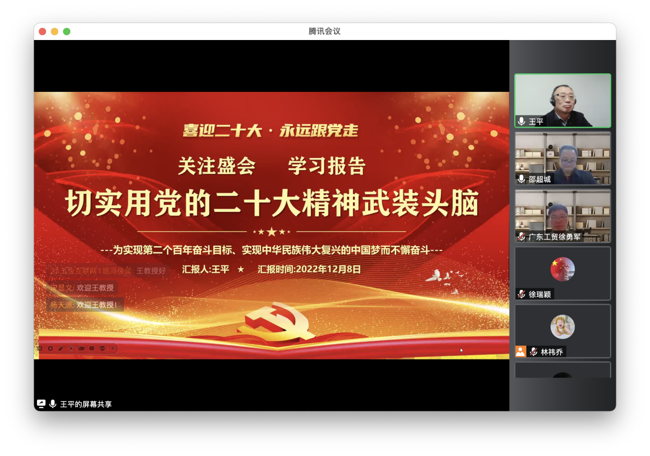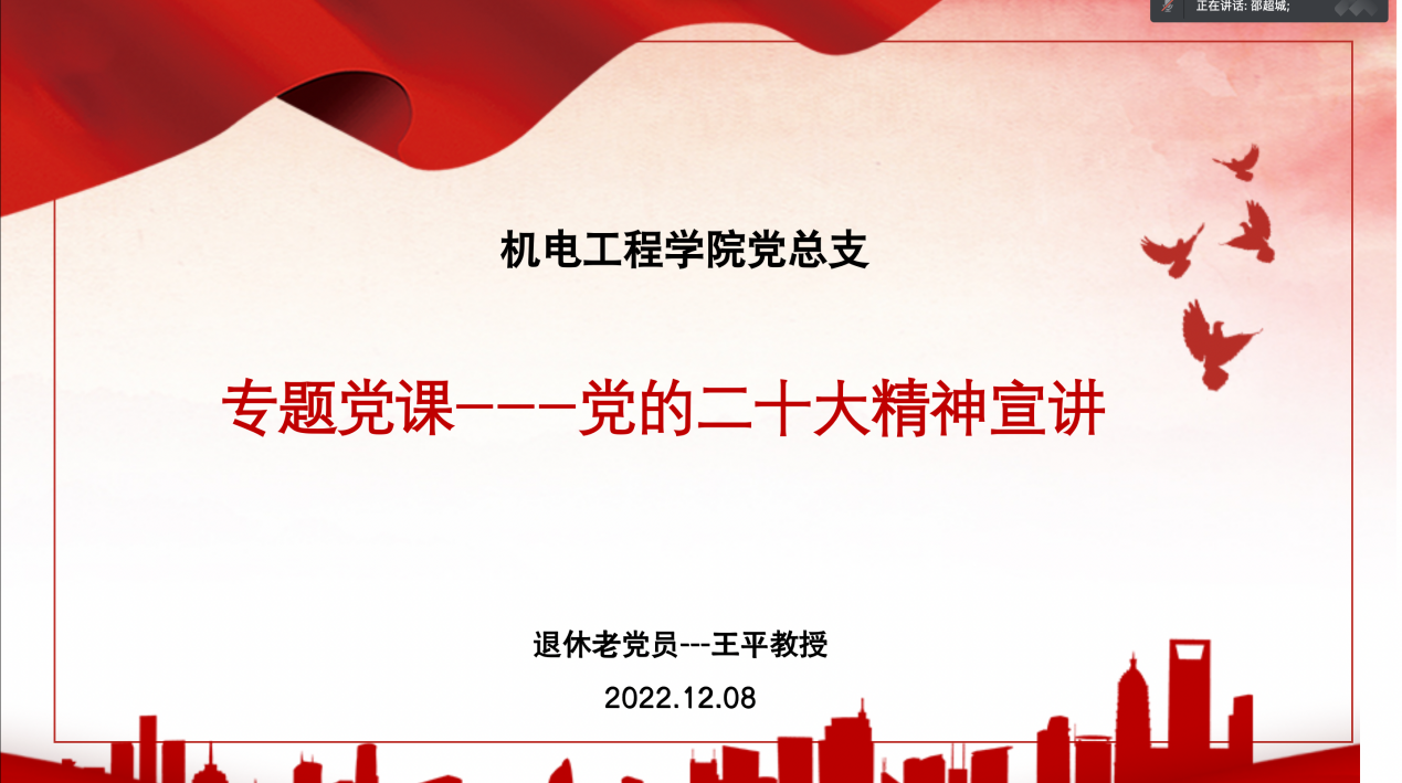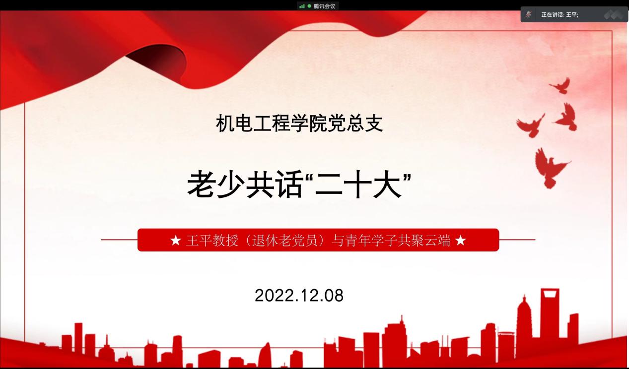 为认真贯彻落实习近平总书记关于学习贯彻党的二十大精神,机电工程学院党总支于12月8日晚上7点30分持续开展党的二十大精神宣讲暨“老少共话二十大”活动,退休老党员王平教授、全体教职工和学生代表参加会议,会议由机电工程学院党总支书记邵超城主持。