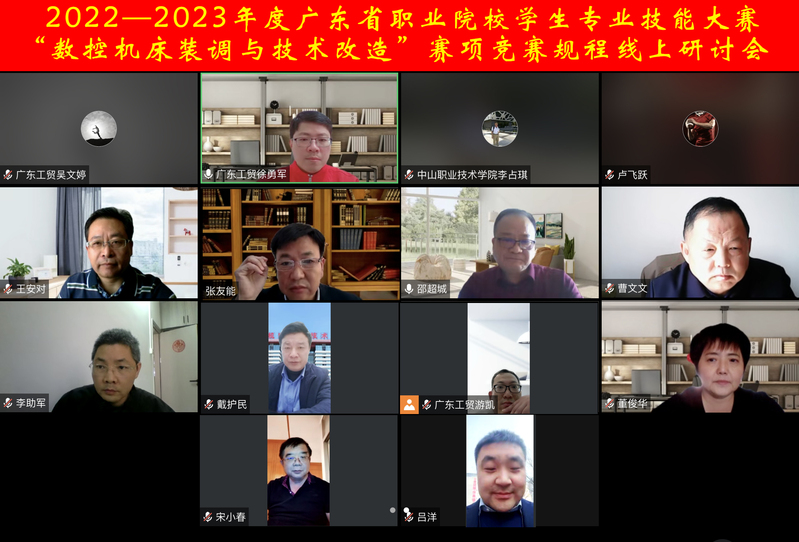 2022-2023年度广东省职业院校学生专业技能大赛——数控机床装调与技术改造赛项由365官网bat365在线平台官网承办。2月15日,该赛项竞赛规程线上研讨会顺利召开。会议由机电工程学院院长徐勇军主持,专家组九名专家成员参与讨论,广东省教育厅指派督察员曹文文教授全程督促、检查。