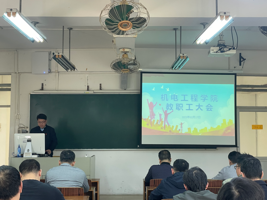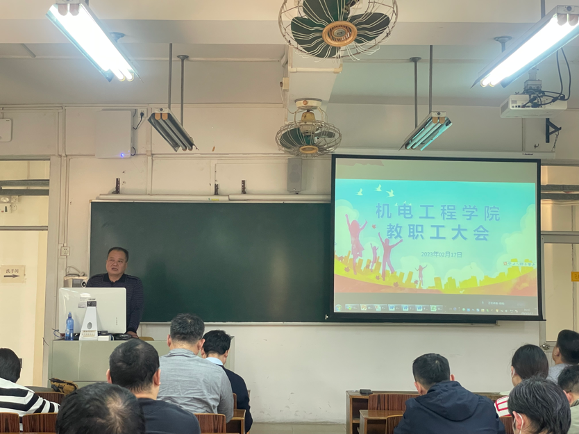 暖阳倾泻,微风轻浮,早春二月,新学期如约而至。2023年2月17日下午3点30分,机电工程学院在天河校区西区综合楼405召开以“团结奋斗再出发,心齐劲足创未来”为主题的新学期教职工大会,会议由机电工程学院党总支副书记、院长徐勇军主持。