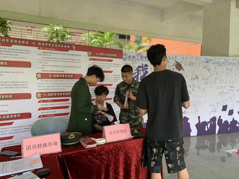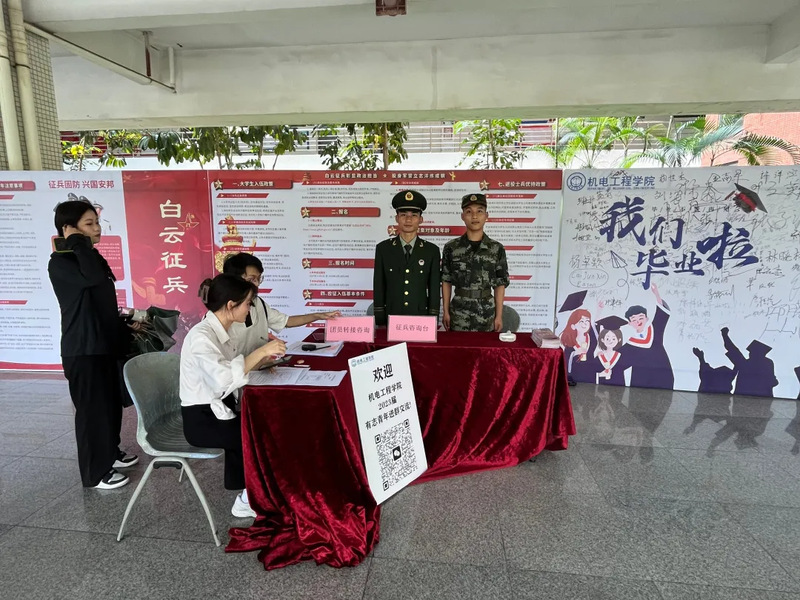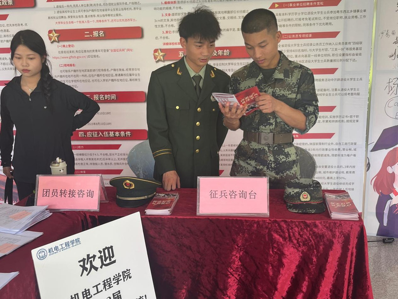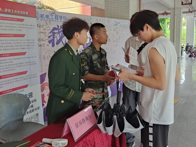 为进一步宣传国家征兵政策,鼓励青年大学生携笔从戎,投身军营,6月27日下午,365官网机电工程学院在明德楼一区为2023届毕业生举办了征兵咨询活动。