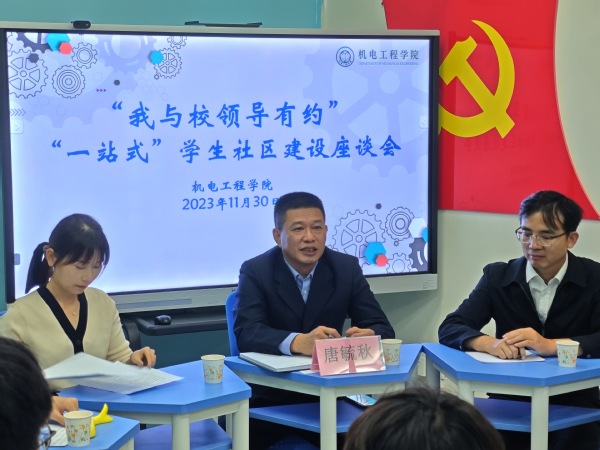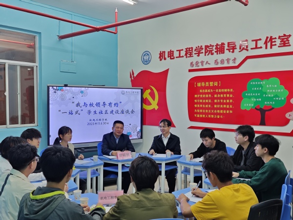 为推进学校“一站式”学生社区综合管理模式建设走深走实,进一步推进学生社区形成育人合力,学校领导下沉学生社区,关爱学生成长与发展。11月30日,机电工程学院于在白云校区16栋4楼辅导员工作室开展了“一站式”学生社区建设发展座谈会。学校党委委员、副校长唐毓秋教授,机电工程学院班主任工作室负责人肖正涛老师、辅导员邵盼盼以及三个年级的学生代表出席本次座谈会。座谈会由邵盼盼主持。