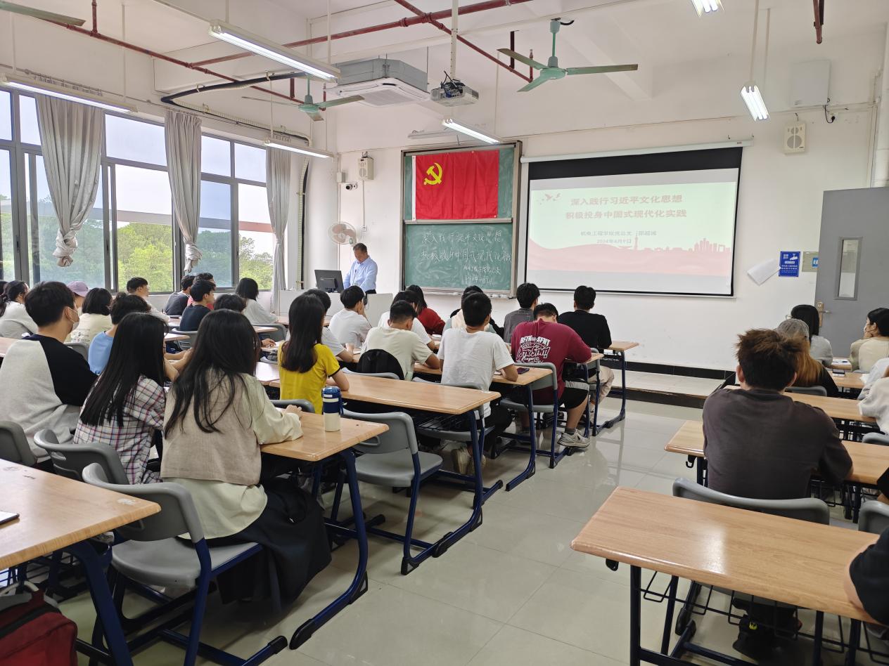 为深入学习贯彻习近平新时代中国特色社会主义思想,激发青年在新时代奋发向前的精神动力,4月9日机电工程学院党总支书记邵超城以“深入践行习近平文化思想,积极投身中国式现代化实践”为题,为机电工程学院学生第二党支部全体党员和入党积极分子讲授“思政第一课”。