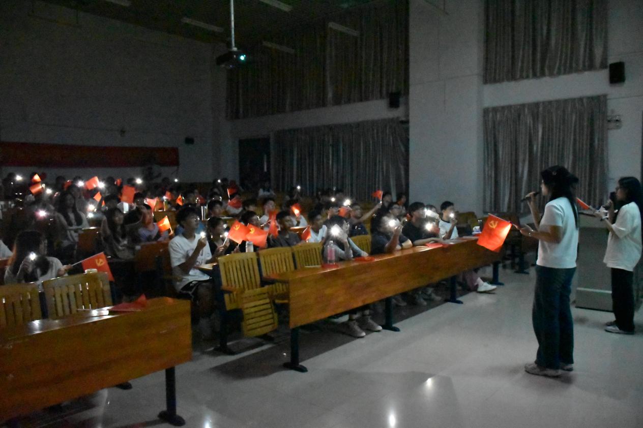 活动开展前,为了让同学们有更好地观影体验,党员同志们提前到达活动地点,布置场地,调试设备。黄丽婷、彭依雨在为影片结束后的彩蛋——献唱《一路生花》,进行最后的排练。同学们准时到达教室后,党员同志为同学们发放红旗,并指引坐。