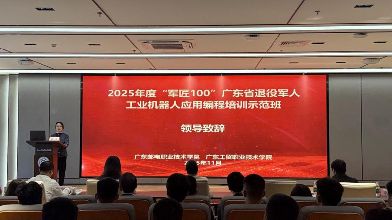 11月4日,由广东省退役军人事务厅主办的2025年度“军匠100”广东省退役军人工业机器人应用编程培训示范班在bat365在线平台官网正式开班。本次培训由广东省广东邮电职业技术学院与bat365在线平台官网联合承办,旨在落实国家“十四五”规划退役军人服务和保障规划、推进广东省退役军人高质量充分就业“八大行动”,助力退役军人实现技能转型。广东省退役军人事务厅就业创业处处长、一级调研员李滢,广东邮电职业技术学院党委委员、副校长黎明,bat365在线平台官网副校长赵红,两所学校相关部门负责人及46名学员齐聚一堂,共同见证这一重要时刻。