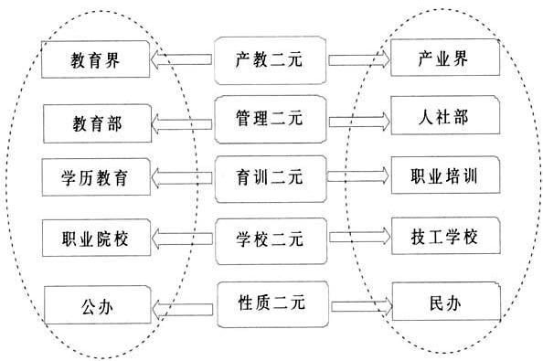 整体上来看,中国职业教育发展现状呈现一种双重二元结构。第一重二元结构是指普通教育和职业教育呈现出二元相对独立发展的态势,这从《现代职业教育体系建设规划(2014-2020年)》中的“教育体系基本框架示意图”可以很清晰地看出。从体系建设的角度而言,职业教育和普通教育正在从小“h”结构向大“H”结构转变,职业教育由原来的层级概念逐渐向类型概念转变。也正因为这种二元结构,职业教育在与普通教育的比较参照中,处于明显不利地位。第二重二元结构是指中国职业教育内部从整体上看也呈现明显的二元结构(见图1)。这种二元结构,对职业教育发展来说,既是现实和特点,也是困难和障碍。这种职业教育双重二元结构的不足,主要体现在五个方面:一是统筹协调难度大,增加管理成本,工作效率低,无法形成合力;二是政出多门、条块分割,不利于国家职业教育事业整体发展;三是资源内耗严重,各自为政,缺乏全局视野,不利于国家资源集中使用,延缓职业教育改革步伐;四是不利于国家人力资源结构的优化整合,加剧人才供需结构性矛盾,拖累产业结构转型升级,影响国家经济社会持续健康稳定发展;五是不利于现代职业教育体系自身建设、职业教育与普通教育、学历教育与非学历教育、学校职业教育与其他形式职业教育之间的统筹规划。